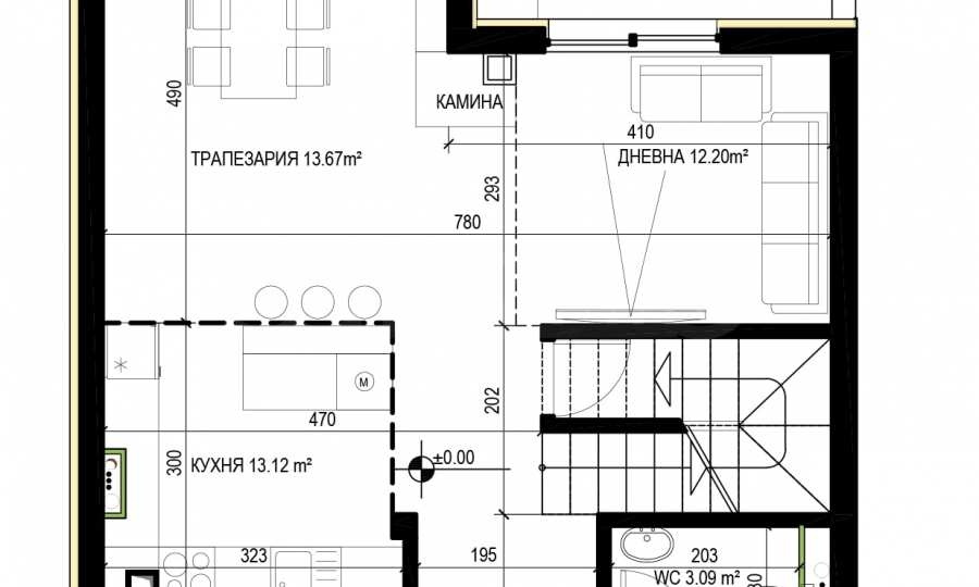 - Na parterze (wysokość ±0,00) znajduje się salon z emporium w części rekreacyjnej o wysokości do trzeciego piętra, jadalnia i kuchnia połączona z zewnętrznym tarasem oraz toaleta; podwórko i miejsce na grilla;