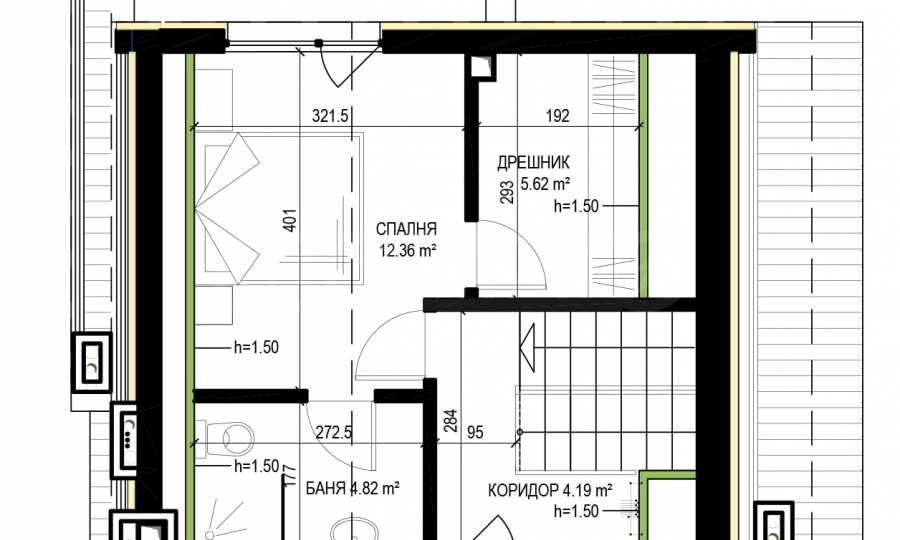 - Na piętrze - dwie sypialnie z łazienkami i toaletami;
