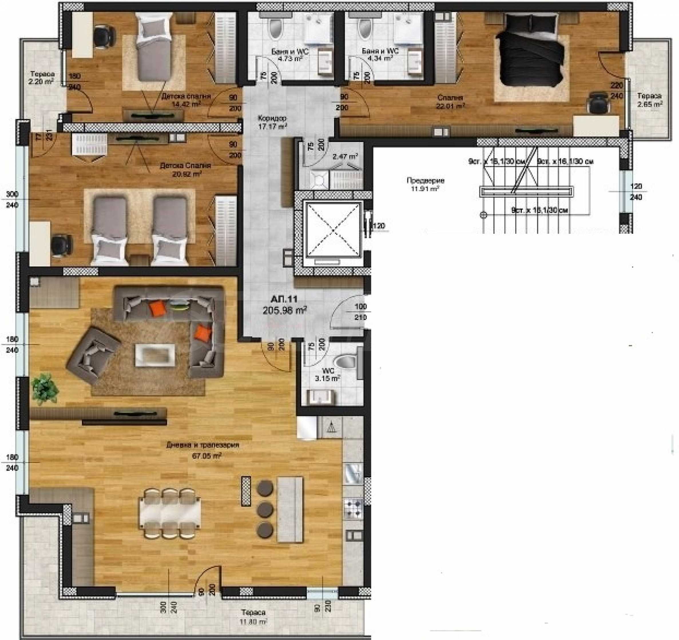 Mieszkanie o powierzchni całkowitej 205,98 m2 zlokalizowane jest na 4 piętrze z 5, z ekspozycją wschód/południe/zachód i ma następujący układ: