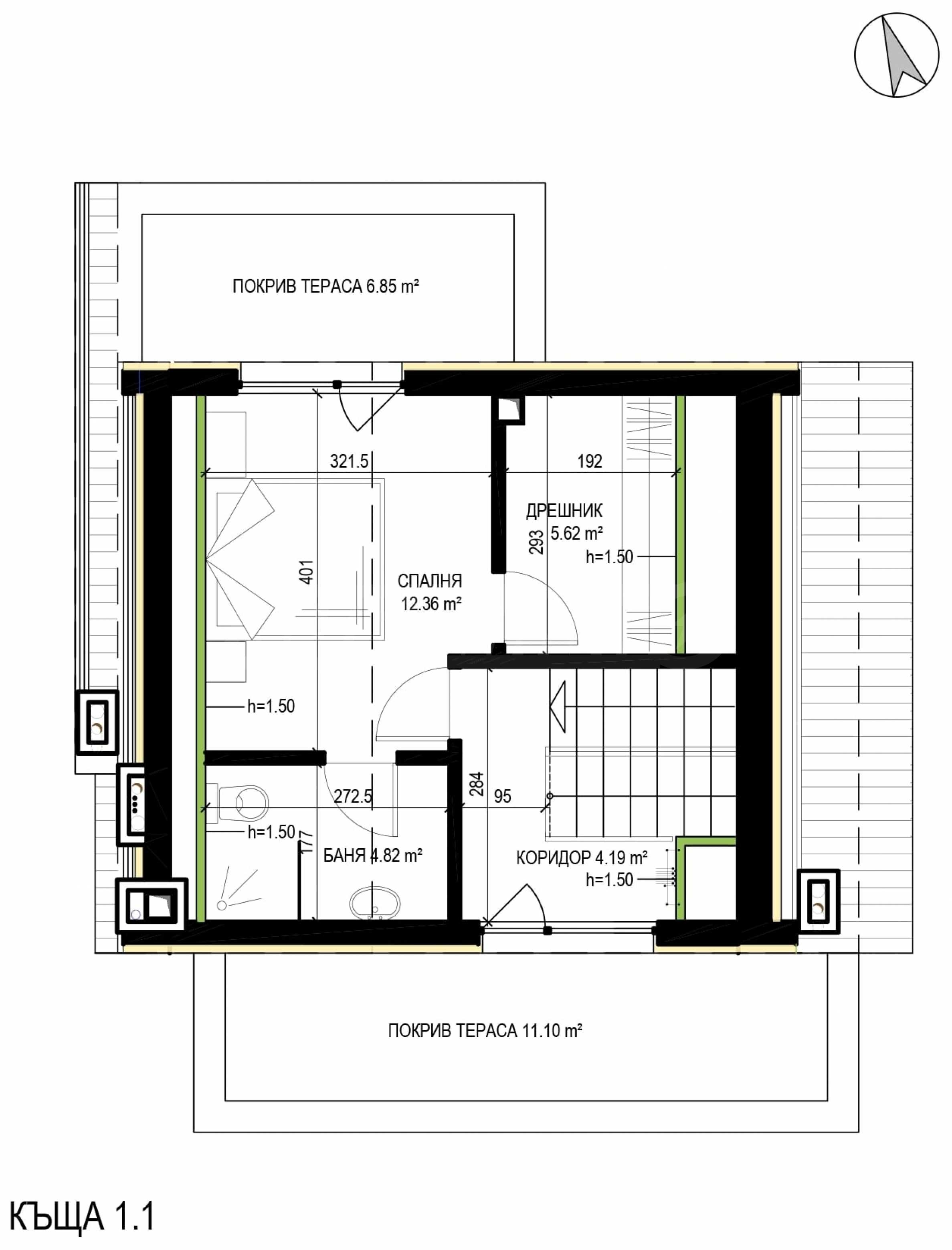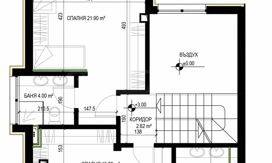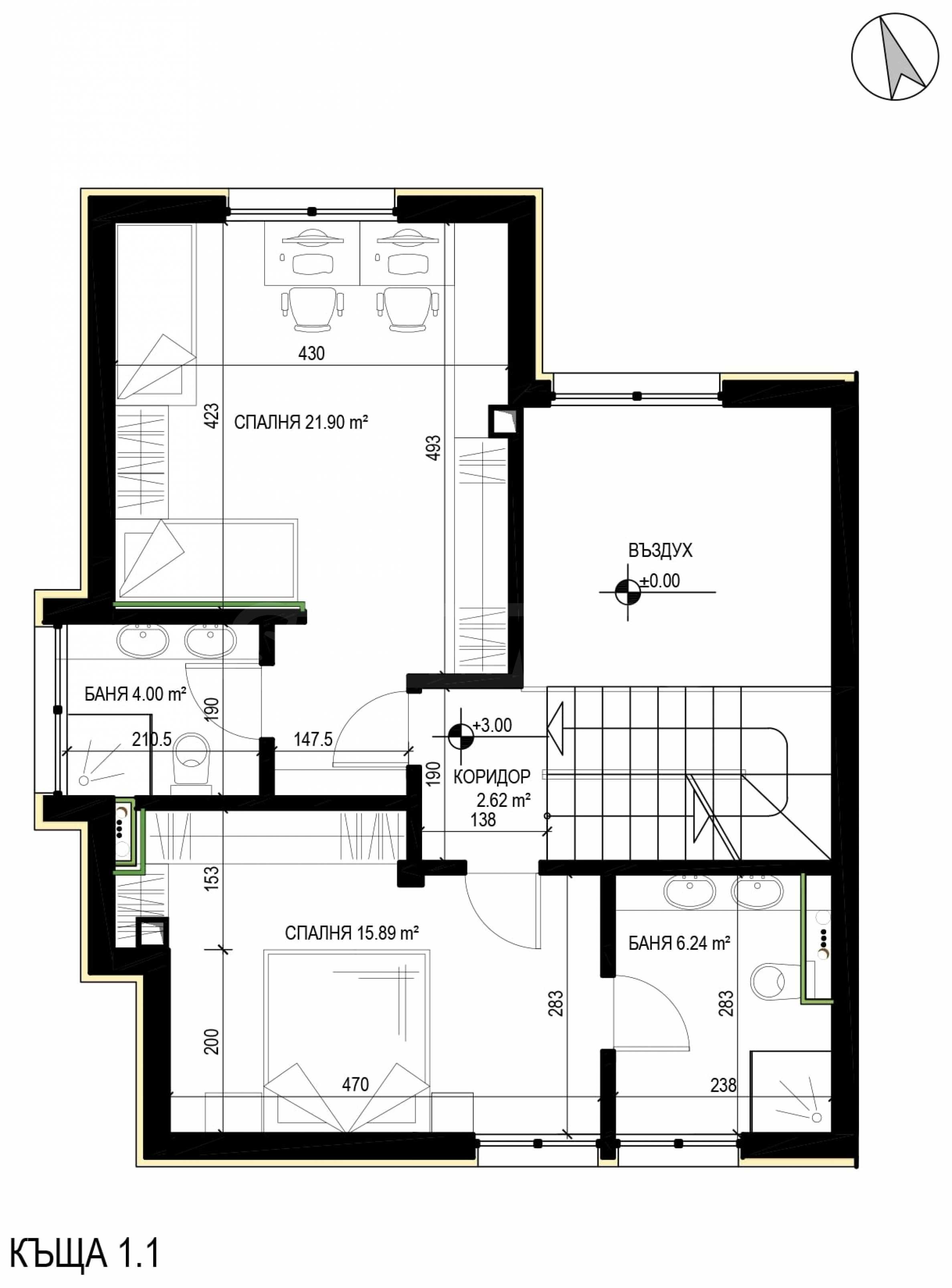 - Na piętrze - dwie sypialnie z łazienkami i toaletami;