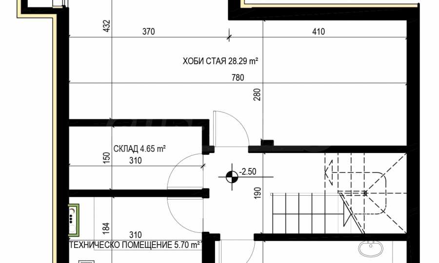 - W przyziemiu (na wysokości -2,40 z naturalnym oświetleniem „angielskiego dziedzińca”) znajdują się pomieszczenia usługowe takie jak magazyn, pomieszczenie mokre oraz pokój hobbystyczny.