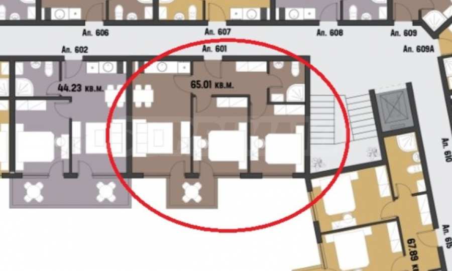 Mieszkanie o powierzchni całkowitej 65,01 m2, zlokalizowane na 6 piętrze, o następującym układzie: