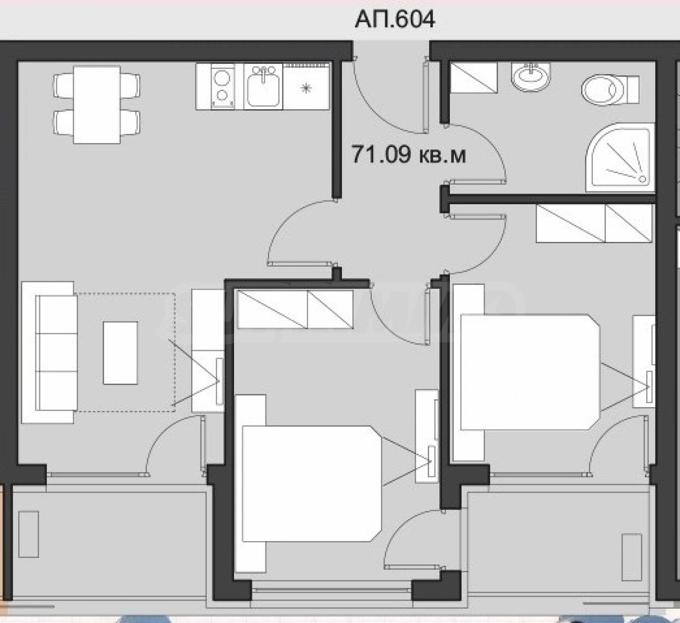 Mieszkanie o powierzchni całkowitej 71,09 m2, zlokalizowane na 6 piętrze z widokiem na basen.