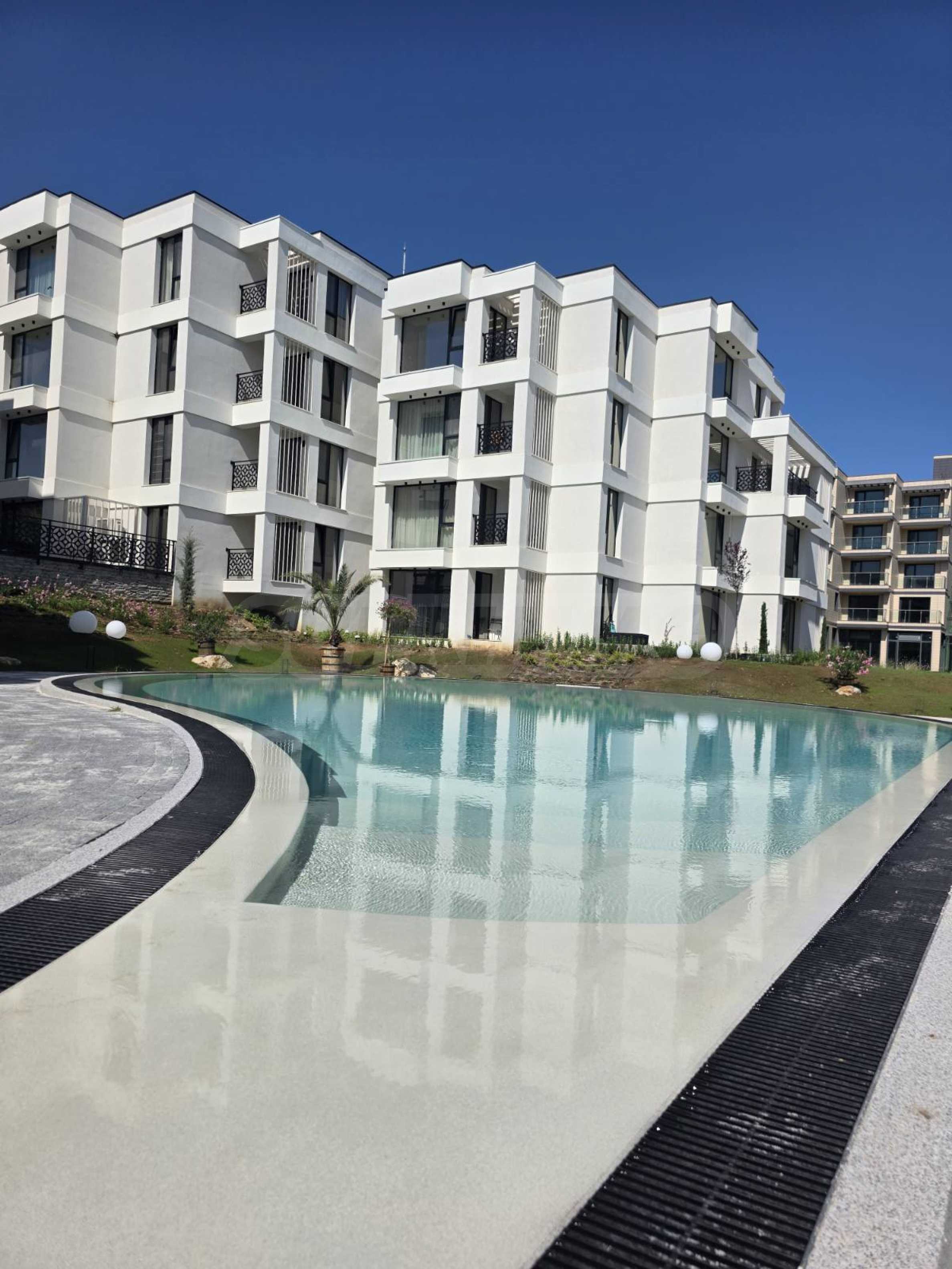 Oferujemy na sprzedaż mieszkanie z jedną sypialnią o powierzchni 58,27 m2, w nowoczesnym luksusowym nowym kompleksie budowlanym tuż przy plaży Kavatsite, najnowszej fazie popularnego kompleksu, zaledwie 3 km od Sozopola.
