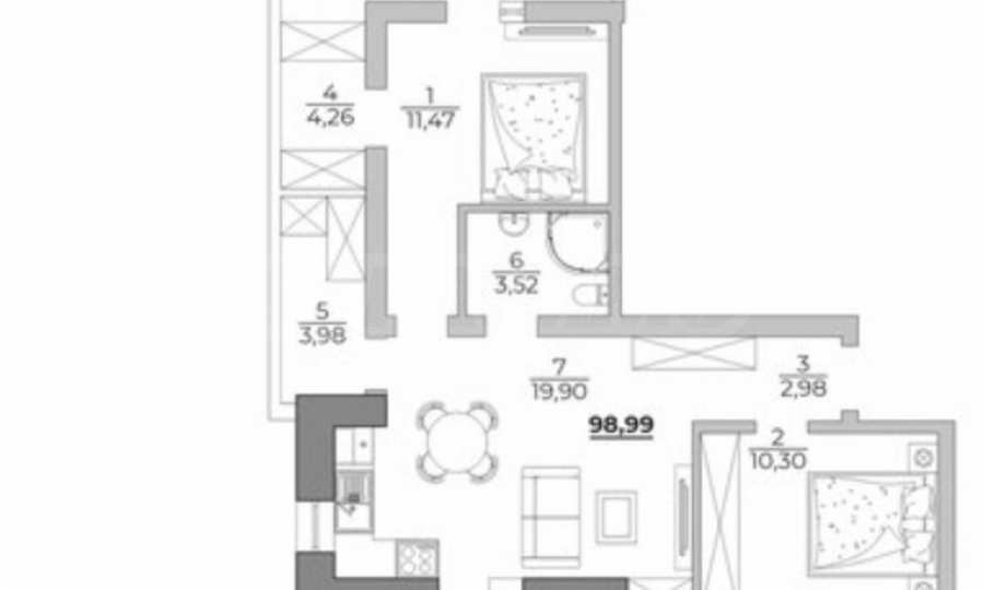Apartament o powierzchni całkowitej 98 m2 znajduje się na 2 piętrze z 5, z widokiem na morze i ma następujący rozkład: