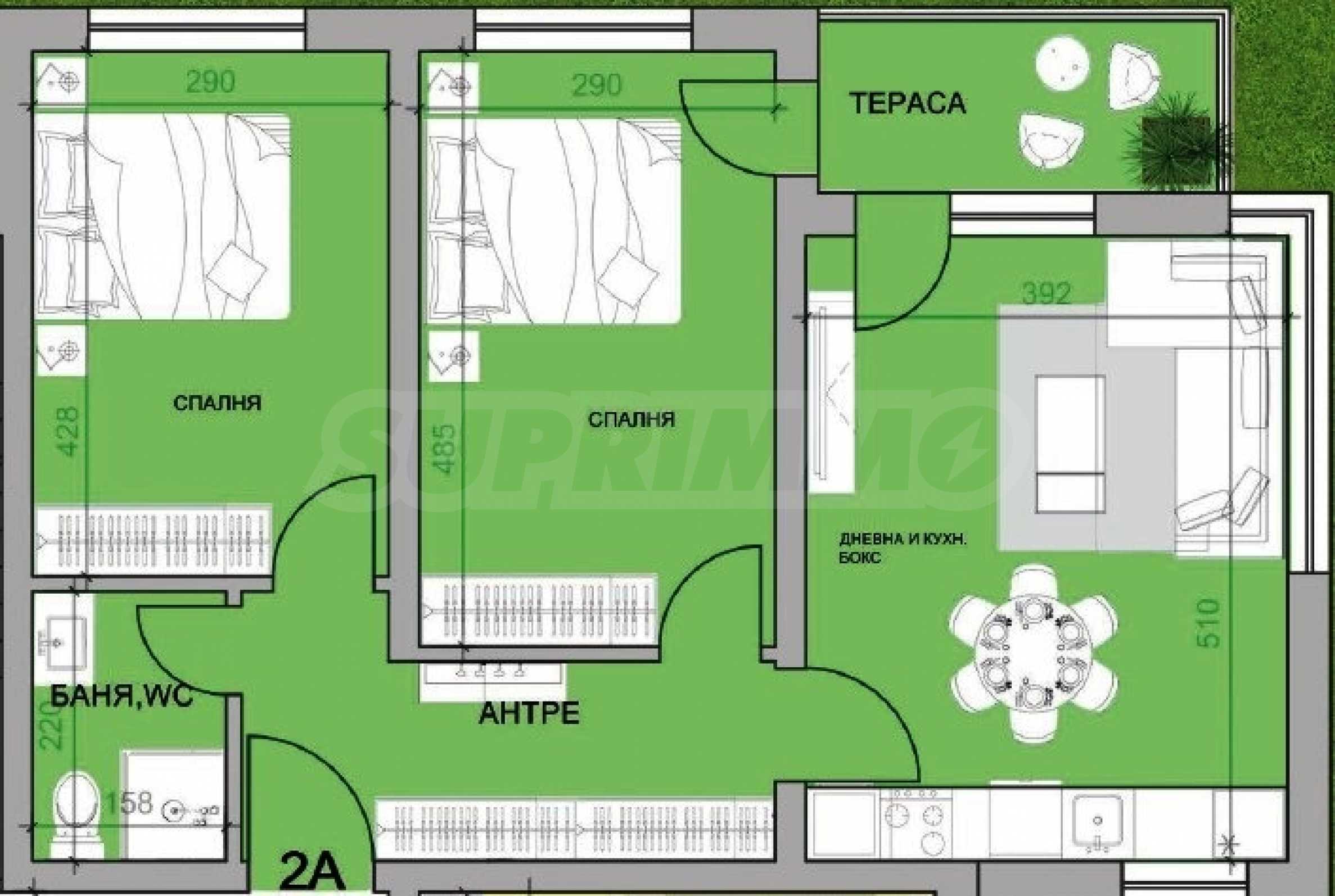 Oferujemy na sprzedaż dwupokojowe mieszkanie w nowym kompleksie, w dzielnicy "Hristo Smirnenski". Dogodna lokalizacja, w odległości spaceru od parku "Rekreacja i Kultura" oraz bazy wioślarskiej, z szybkim dostępem do centrum miasta. W bezpośrednim sąsiedztwie znajdują się centrum handlowe Mall Plovdiv, duże supermarkety - Lidl, Lexi, szpital "Pulmed", a także szkoły i przedszkola.