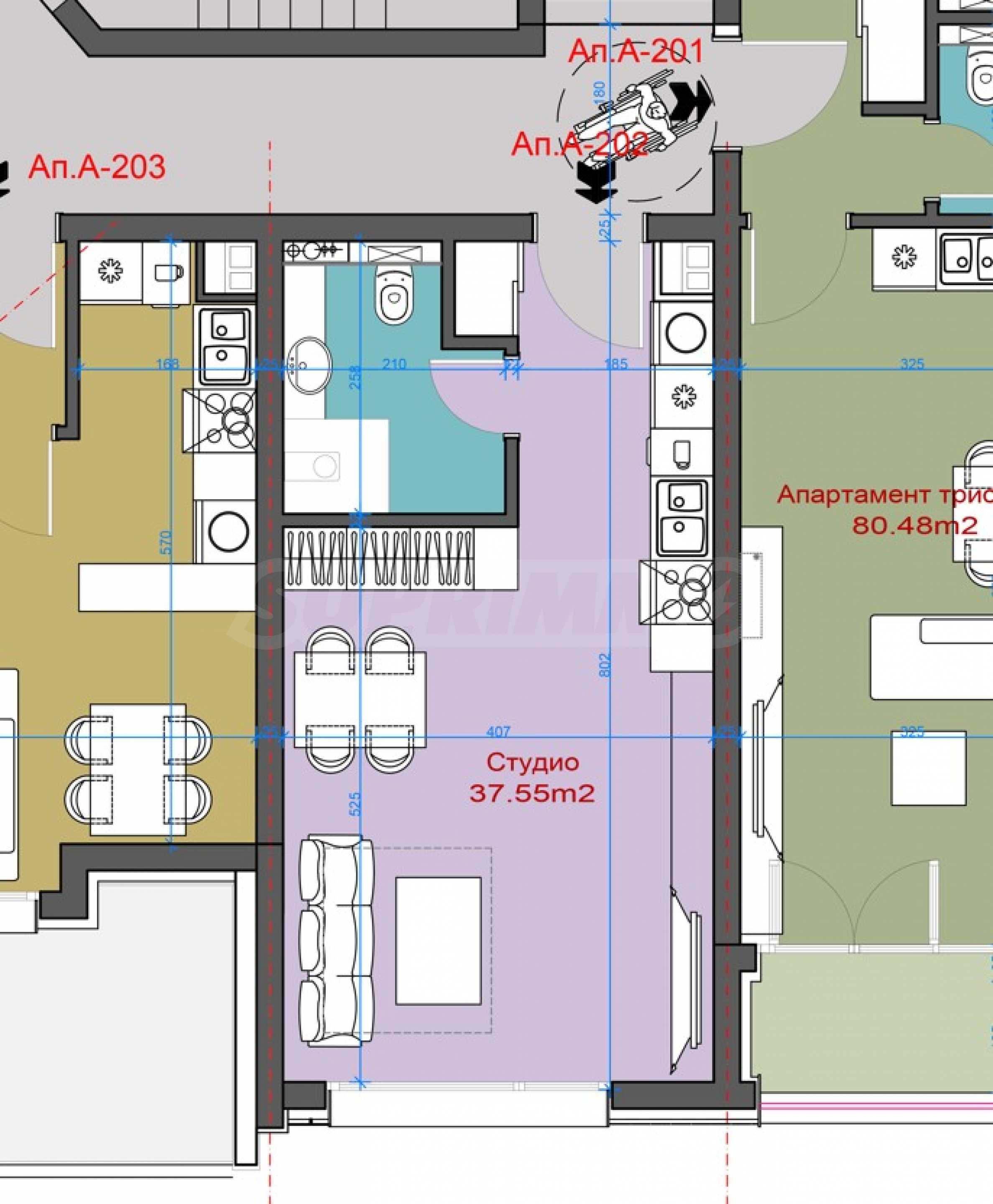 Oferowane studio ma powierzchnię całkowitą 44,39 mkw. (powierzchnia netto 37,76 mkw. + powierzchnie wspólne 6,63 mkw.), znajduje się na 3 piętrze i jest wynajmowane w stanie wykończenia „pod klucz”.