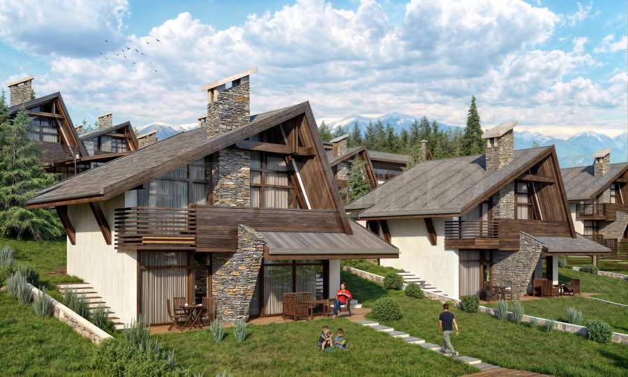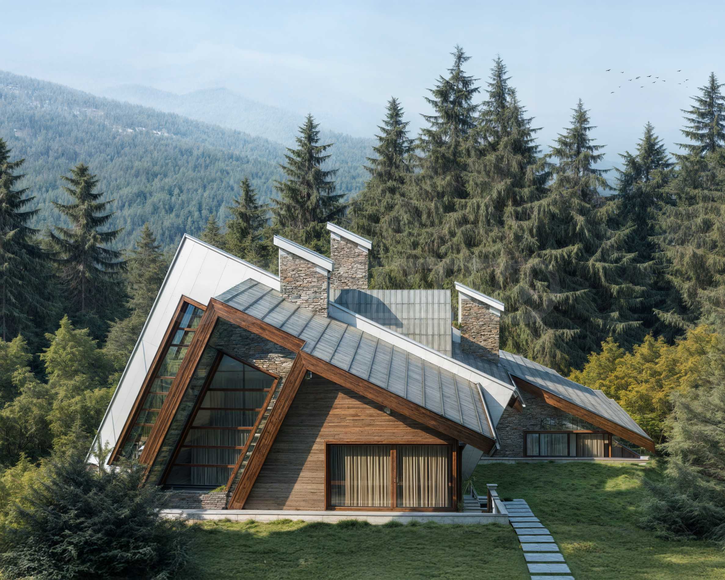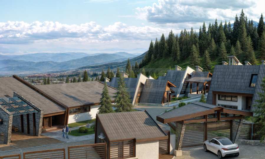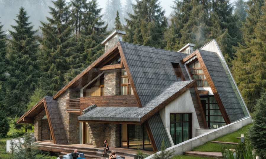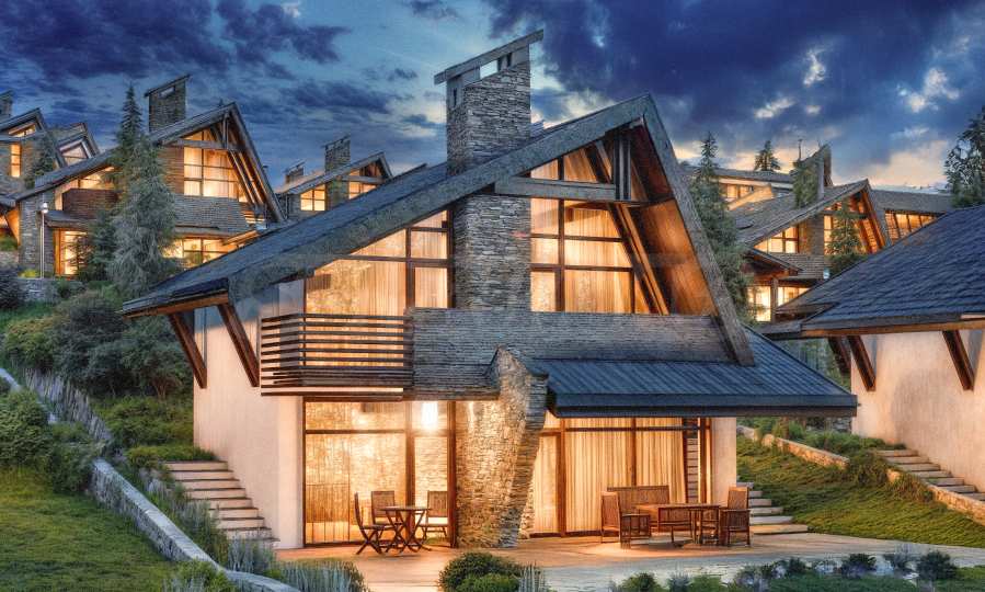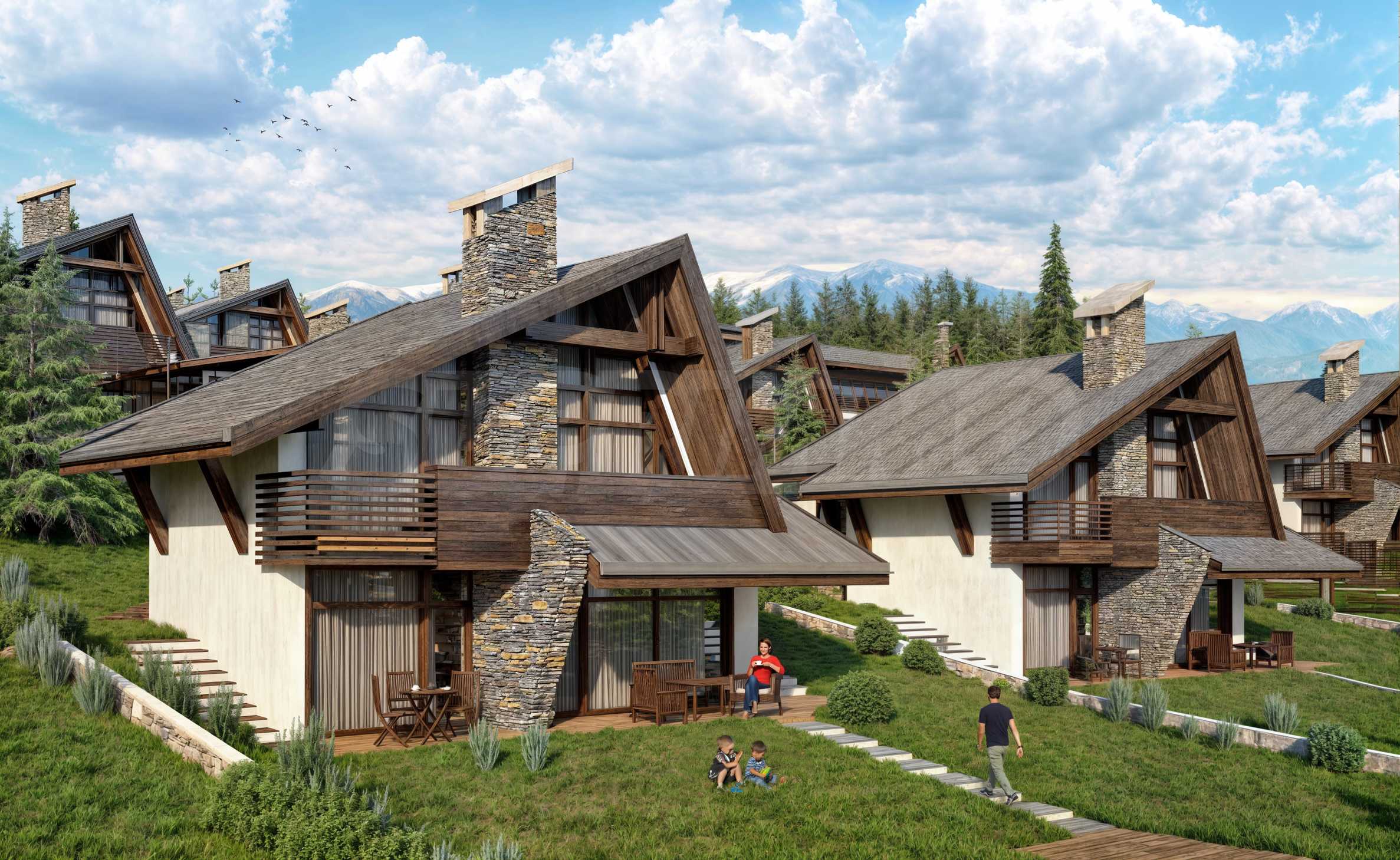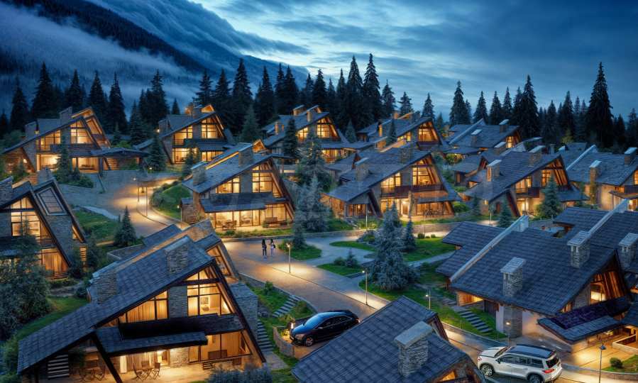 Imponujące domy zaprojektowano w nowoczesnym stylu alpejskim, łączącym tradycyjne elementy z nowoczesnymi rozwiązaniami architektonicznymi. Wyróżniają się spadzistymi dachami, wykorzystaniem naturalnych materiałów, takich jak drewno i kamień, a także dużymi przeszkleniami, które tworzą więź z naturą. Projekt jest dynamiczny i niekonwencjonalny, z asymetrycznymi liniami i oryginalnymi kątami, które nadają nowoczesny wygląd, zachowując jednocześnie poczucie przytulności i ciepła. Architektura domów idealnie wpisuje się w górskie środowisko, oferując komfort, estetykę i funkcjonalność w jednym.