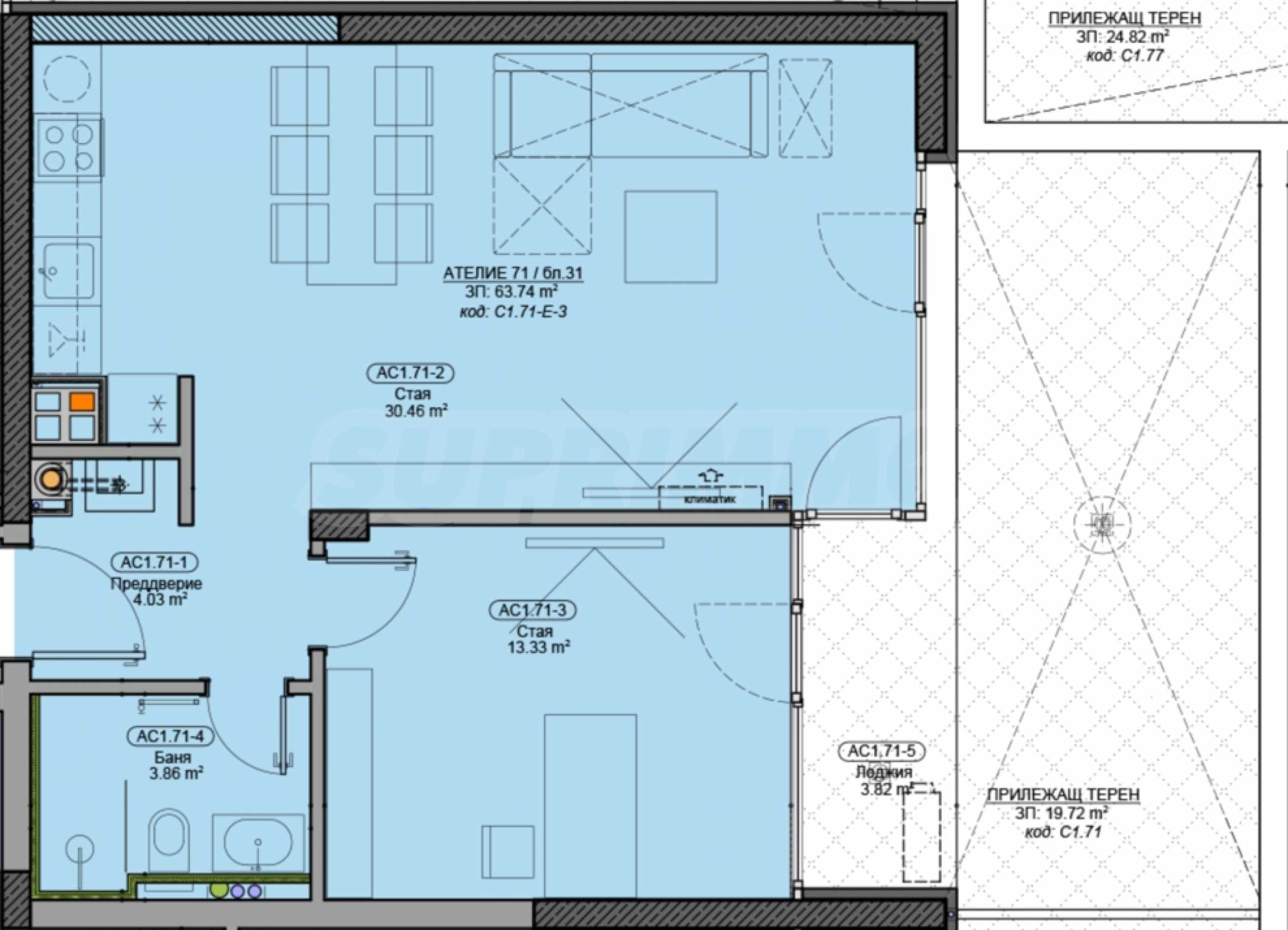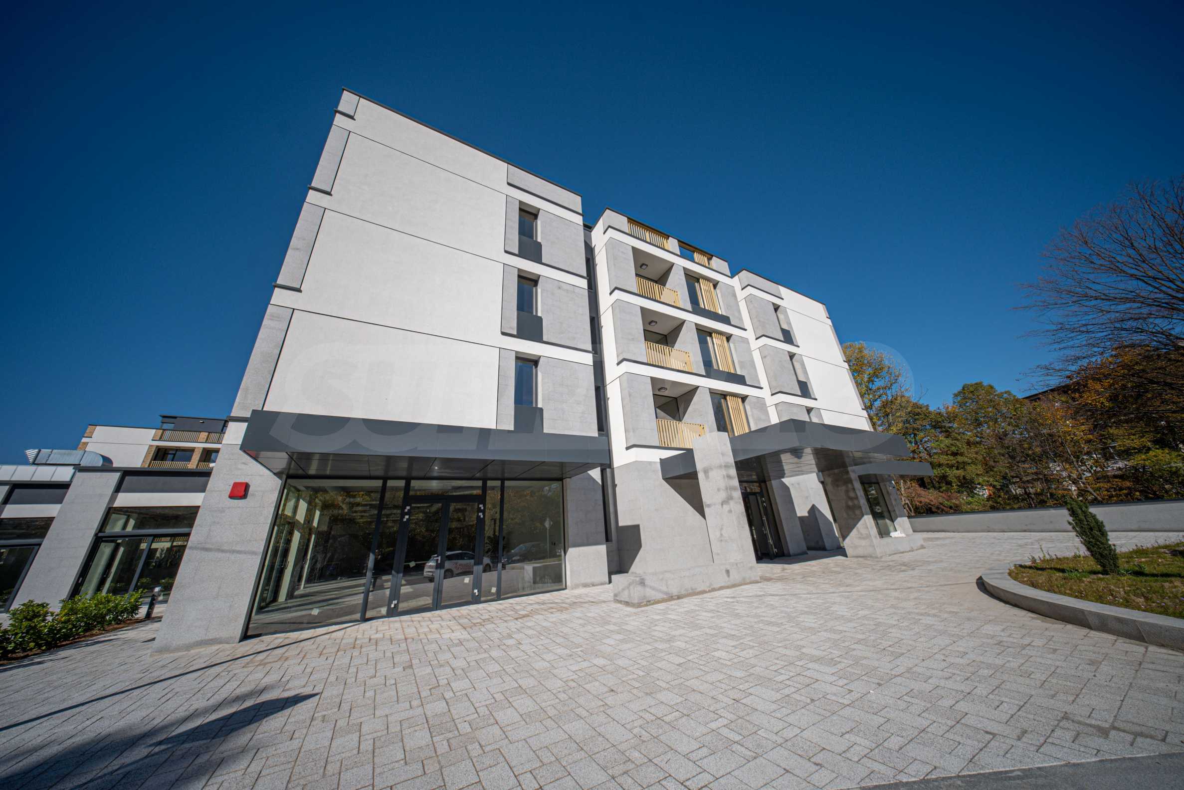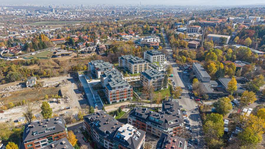 Oferujemy do sprzedaży komfortowe mieszkanie jednopokojowe z prywatnym podwórkiem, zlokalizowane w innowacyjnym, strzeżonym kompleksie przy ul. Act 16 w dzielnicy Boyana.