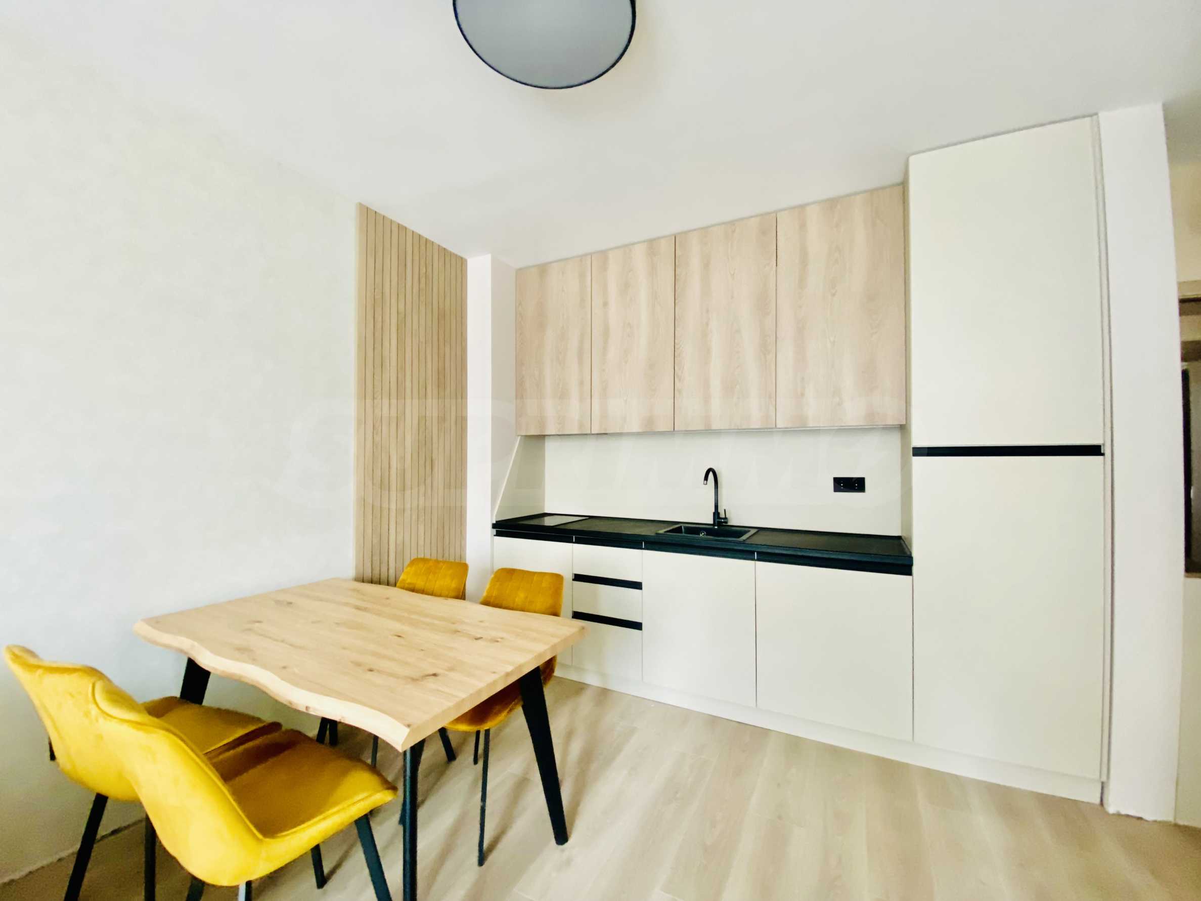 - Aneks kuchenny z szafkami i sprzętem AGD - wbudowany okap, płyta ceramiczna ze sterowaniem sensorowym, wbudowana lodówka z zamrażalnikiem - 187 l o wymiarach 1225/540/545, zlew i bateria kompozytowa - kolor czarny, stół jadalny z czterema krzesłami, rozkładana sofa, stolik kawowy, komoda ze stołkiem, telewizor 43", wieszak, szafka na buty, oświetlenie, cienka zasłona i grube zasłony;