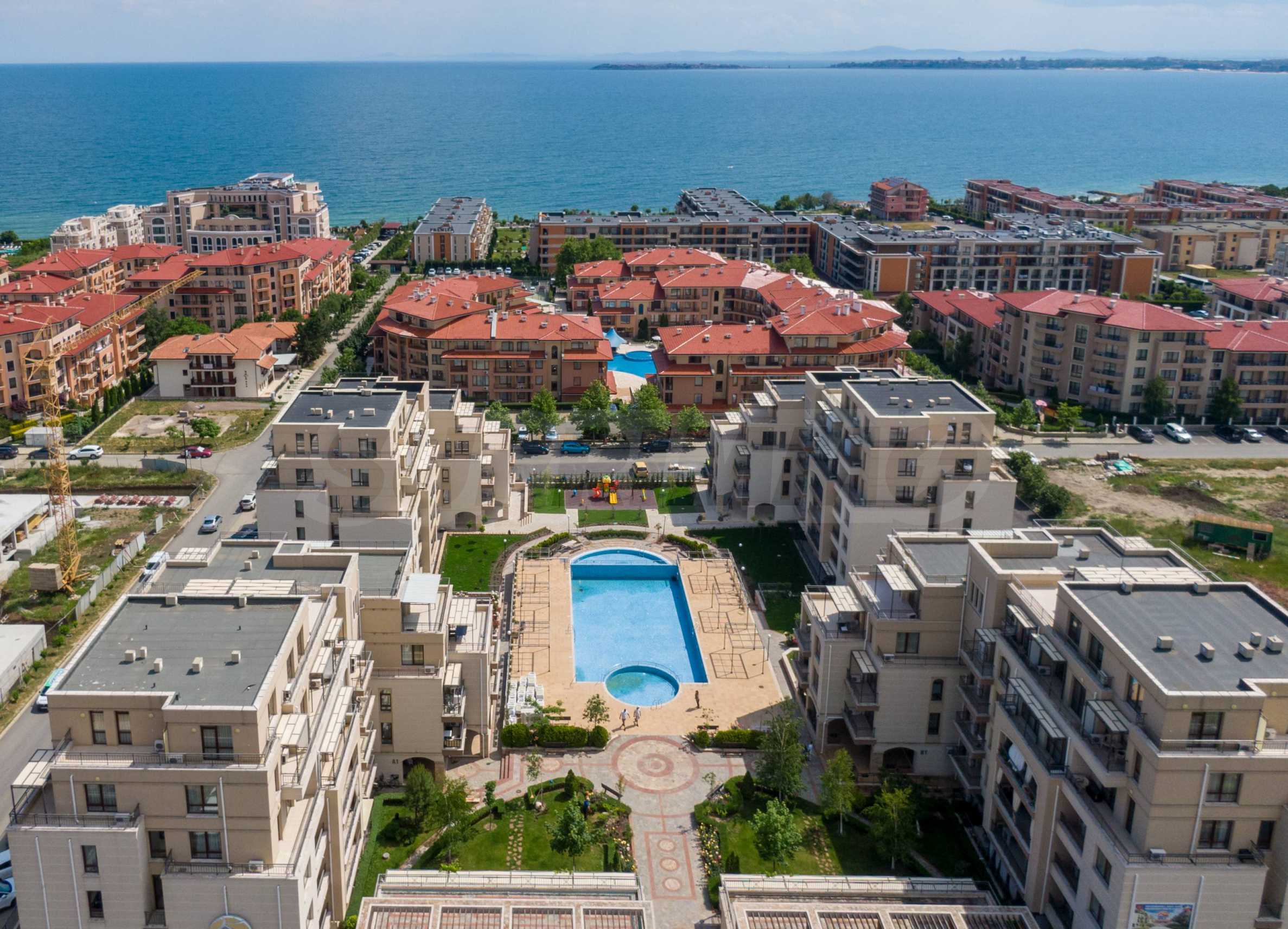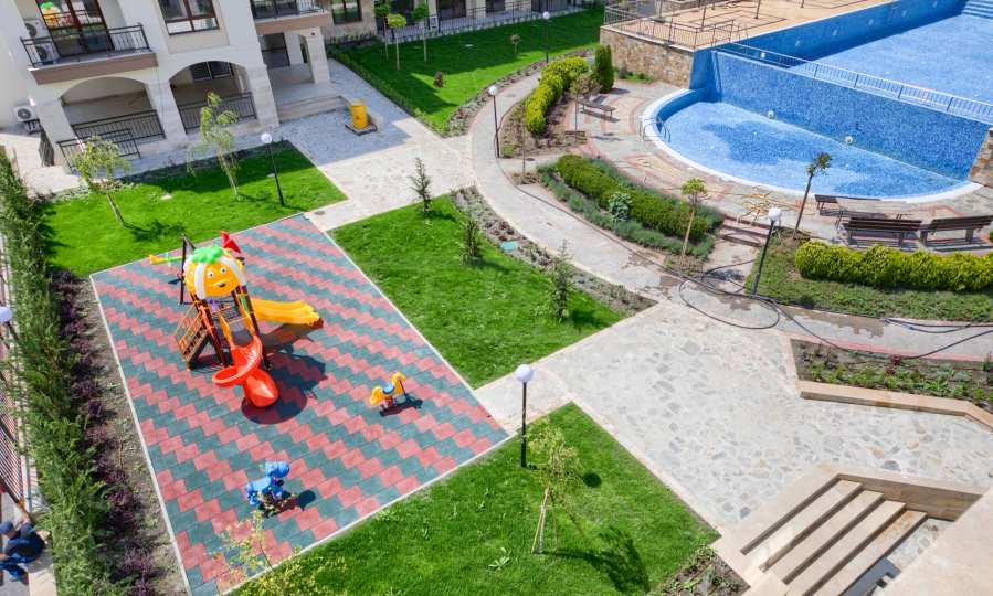 Przytulny kompleks składa się z dwóch sześciopiętrowych budynków położonych naprzeciw siebie oraz dwóch jednopiętrowych budynków usytuowanych po obu stronach głównego wejścia. Trwają prace nad budową dwóch nowych sześciopiętrowych budynków, które będą ustawione równolegle do pozostałych i razem utworzą okrąg wokół basenu i ogrodu kompleksu. Na terenie kompleksu znajduje się basen z częścią dla dzieci i drugi, oddzielny basen dla dzieci, plac zabaw i recepcja. Na terenie obiektu znajduje się znakomita restauracja, a obok budynku znajdują się miejsca parkingowe. Na terenie obiektu znajduje się duży supermarket, centrum SPA i fitness, restauracje i inne udogodnienia.