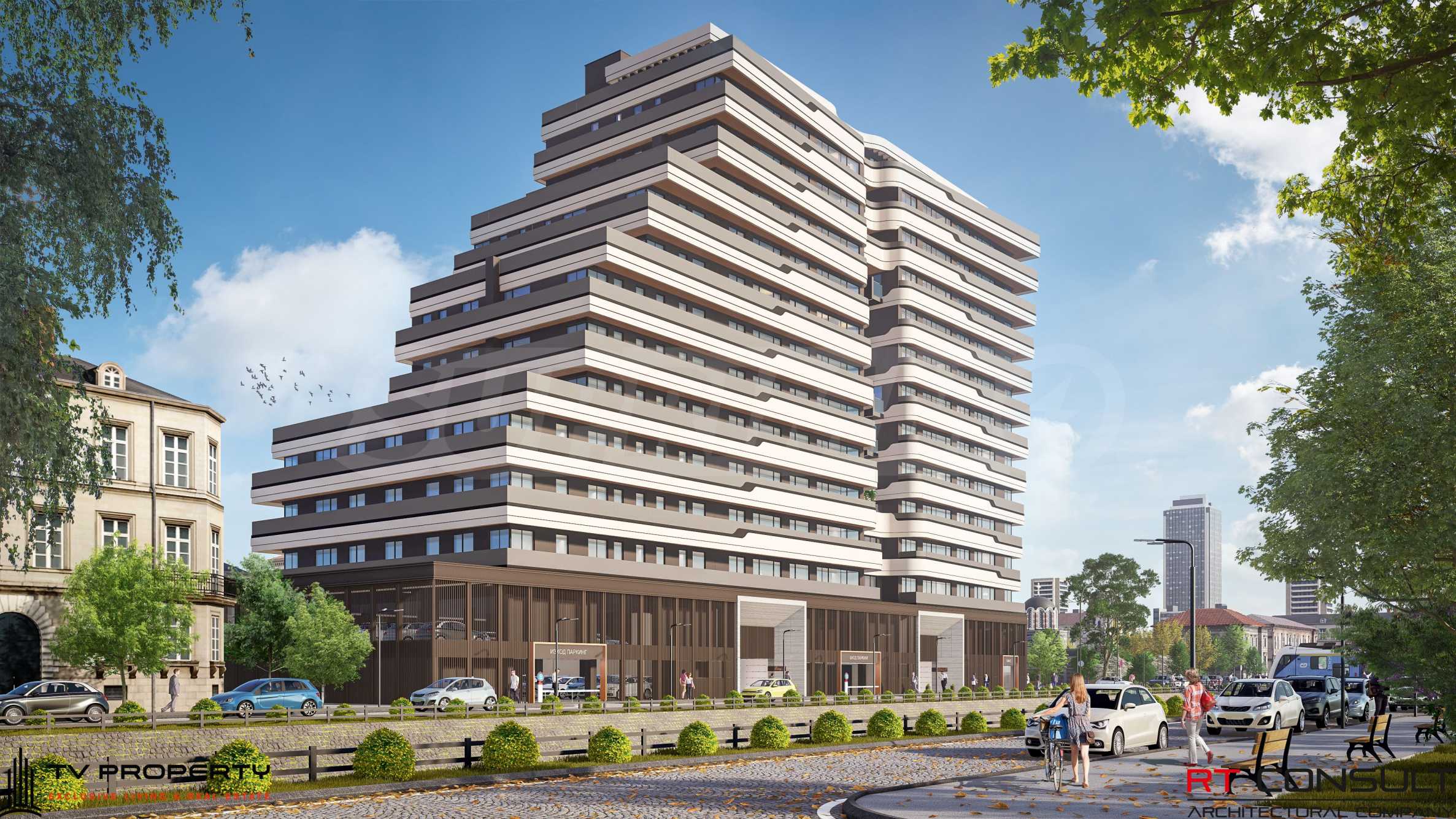 Fasada budynku ma czyste kształty i elementy dekoracyjne, które podkreślają bryłę. Z budynku roztacza się malowniczy widok na góry i pomnik-świątynię „Św. Aleksandra Newskiego”. Zaplanowano budowę bogato zagospodarowanego tarasu na dachu, dostępnego dla publiczności. Luksusowe wykończenie części wspólnych z ochroną, na parterze przewidziano pomieszczenia handlowe.