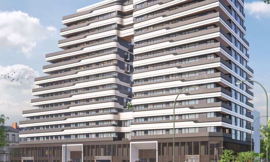 • Parter ma wykończenie etalbondem, które naturalnie przechodzi poprzez ozdobne elementy ochrony przeciwsłonecznej na wysokości aż do ozdobnego profilu, który obramowuje przestrzeń publiczną;