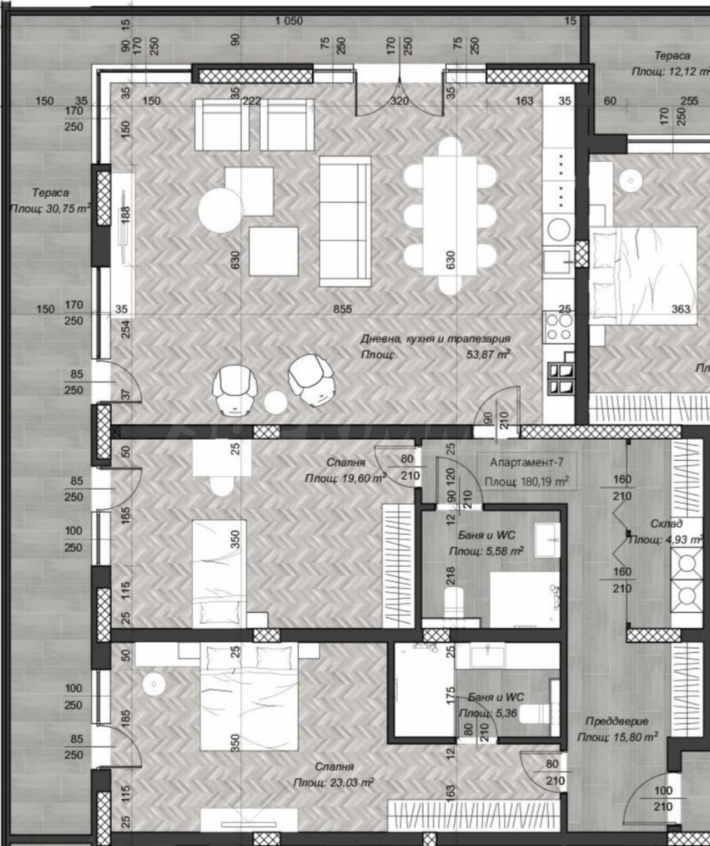 Apartament ma powierzchnię całkowitą 212,47 mkw. m2 (powierzchnia zabudowana 180,19 m2 i powierzchnie wspólne 32,28 m2).