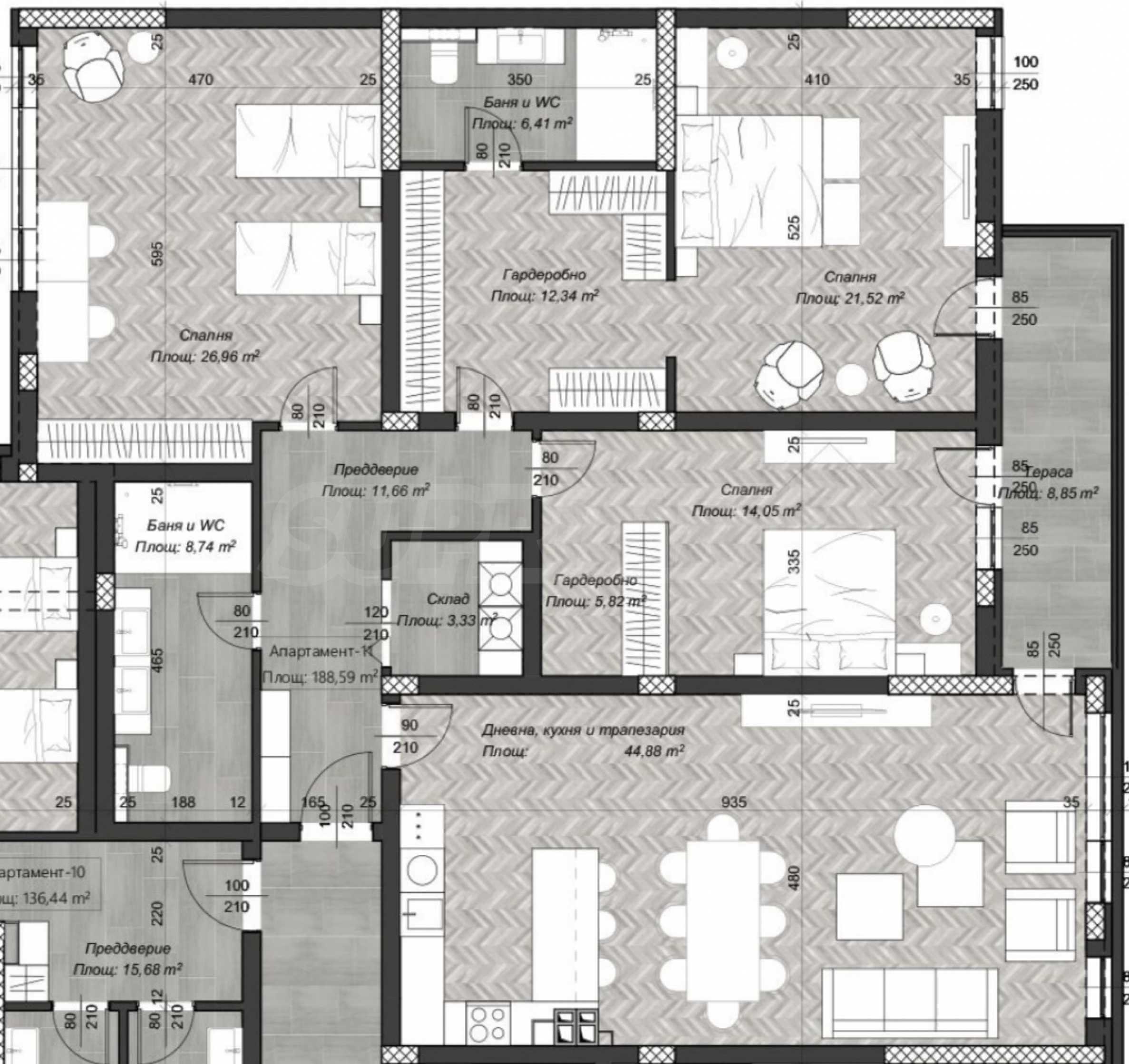 Prezentujemy czteropokojowe mieszkanie w ekskluzywnym, nowym budynku, położonym w pobliżu centrum handlowego Sofia Mall, przystanków autobusowych i stacji metra „Konstantin Velichkov”. W okolicy znajdują się przedszkole, kościół, parki, sklep spożywczy, restauracje i inne udogodnienia.