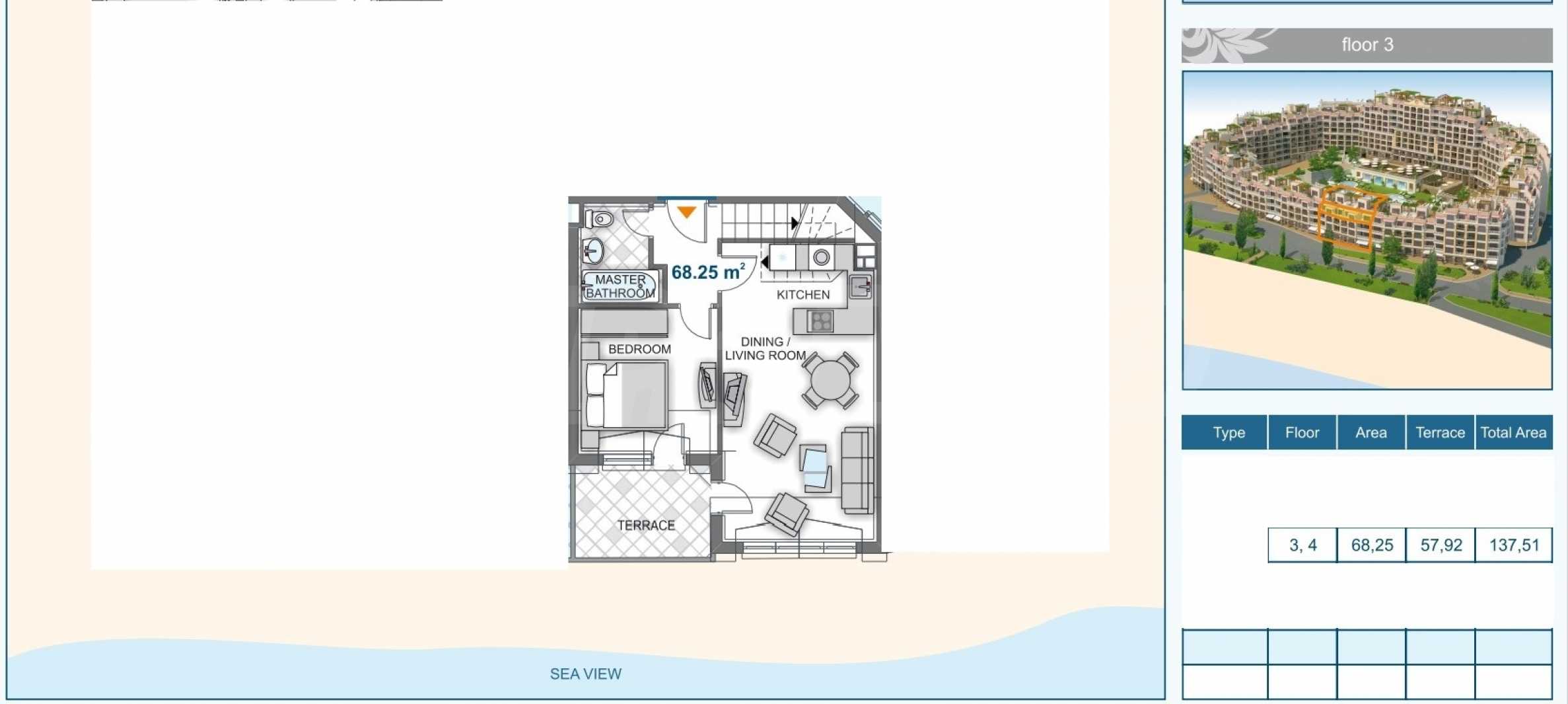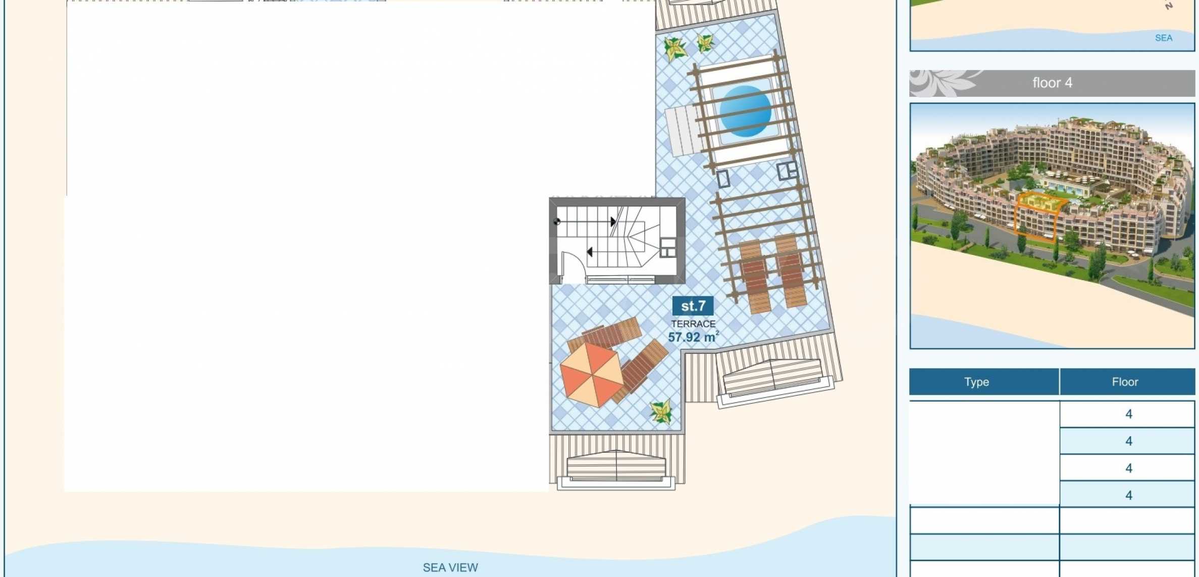 Prezentujemy komfortowy apartament z jedną sypialnią - panoramiczny penthouse, z imponującym tarasem o powierzchni 57,92 m2, z widokiem na morze i plażę.