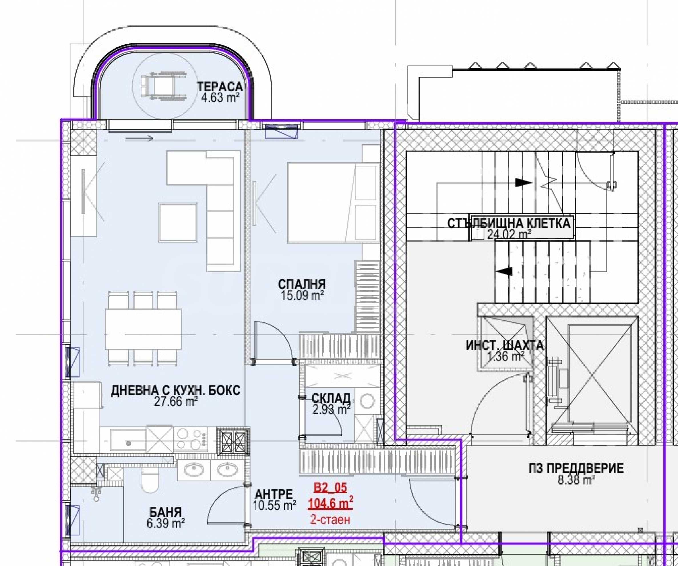 Nieruchomość położona jest na 7 piętrze i ma powierzchnię całkowitą 104,60 mkw., ekspozycja korzystna - południowy zachód/zachód. Składa się z przedpokoju/korytarza, pomieszczenia gospodarczego, łazienki/toalety, jednej sypialni, salonu z kuchnią i tarasu. Dom oferowany jest w stopniu wykończenia zgodnym z bułgarskimi normami budowlanymi, z przyłączami do ogrzewania podłogowego i nowoczesnej klimatyzacji.