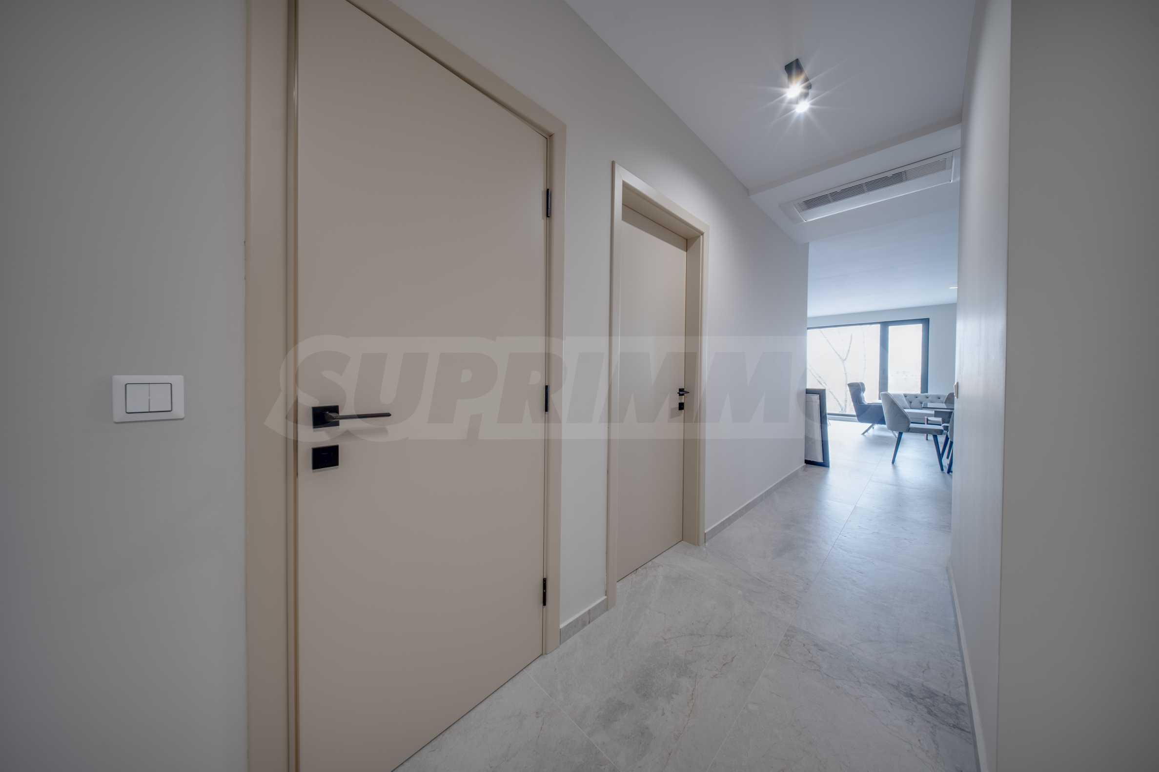 Podłogi wykonane są z wysokiej jakości płytek granitowych i naturalnego parkietu, ściany pomalowano farbą lateksową w neutralnych kolorach, a wysokiej klasy meble i wyposażenie zaprojektowano indywidualnie.
