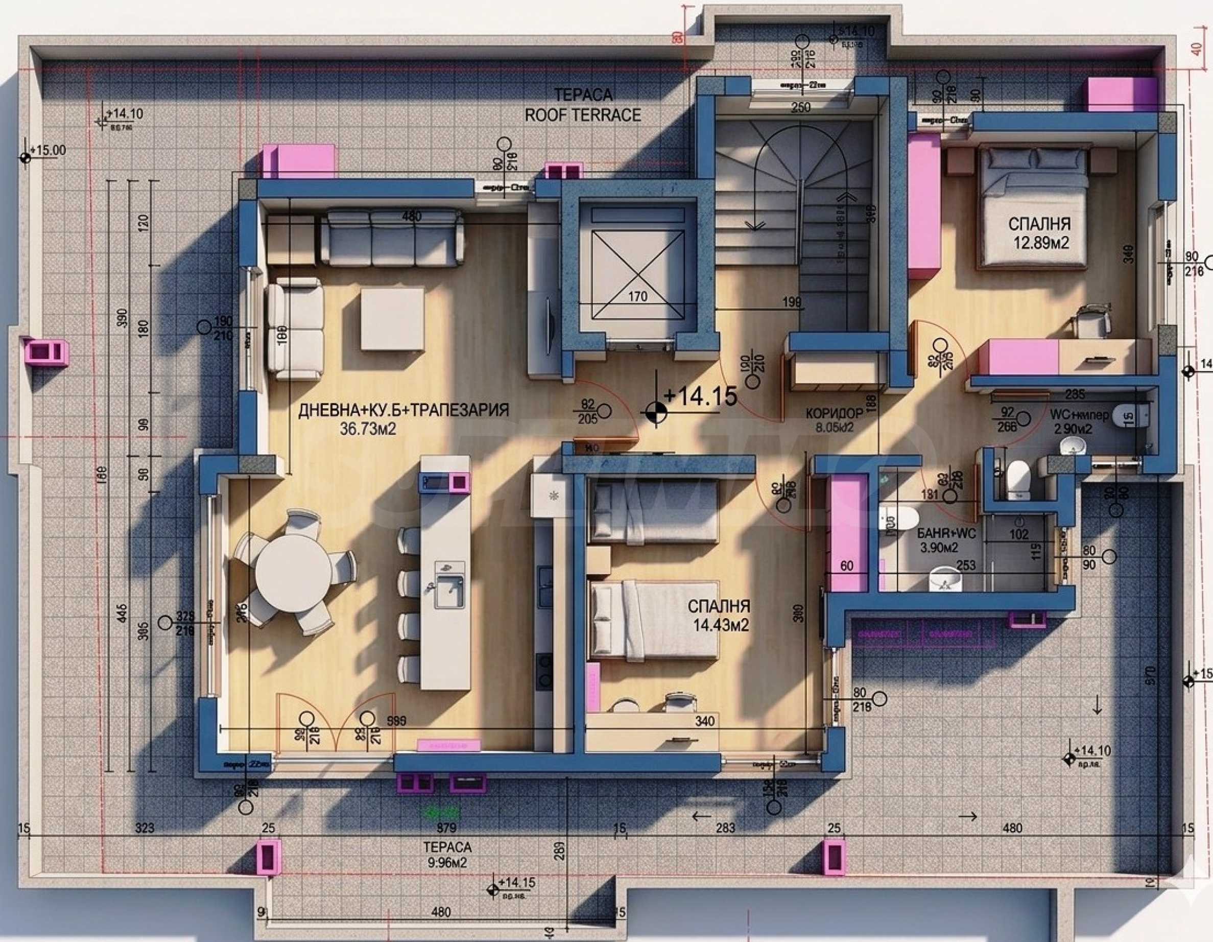 Mieszkanie o powierzchni całkowitej 123,22 mkw. znajduje się na 6. piętrze w 6. bloku. Mieszkanie jest oferowane w stanie deweloperskim zgodnym z bułgarskimi standardami, z gładzią i wylewką, z oknami aluminiowymi z szybami całorocznymi.