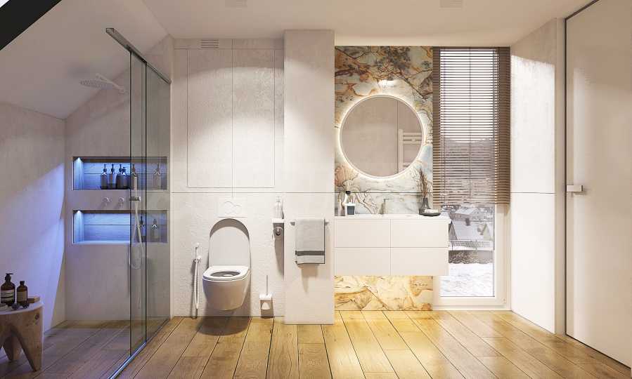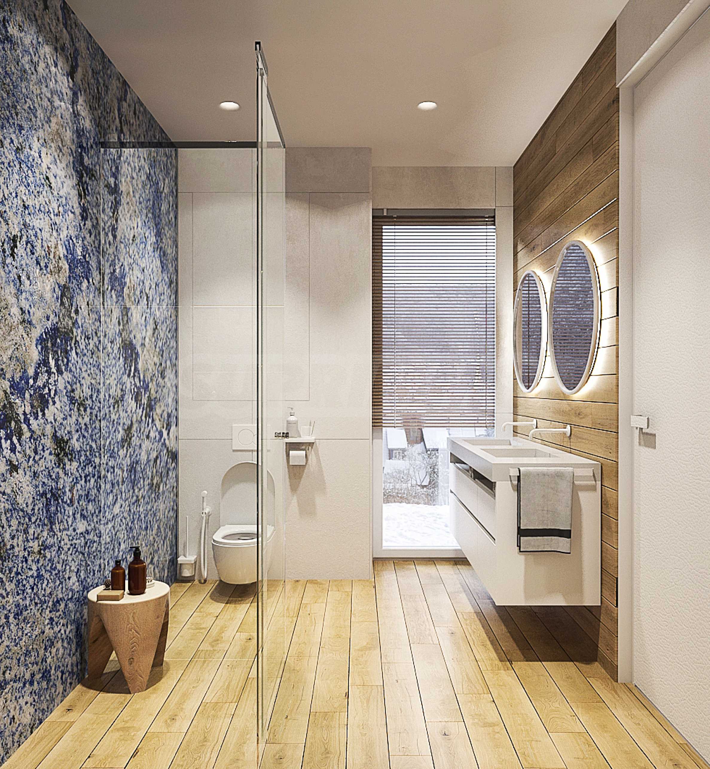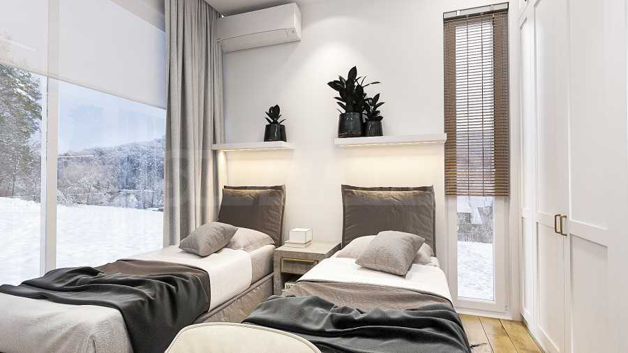 • piętro 2: trzy sypialnie, trzy łazienki, garderoba, pralnia i taras;