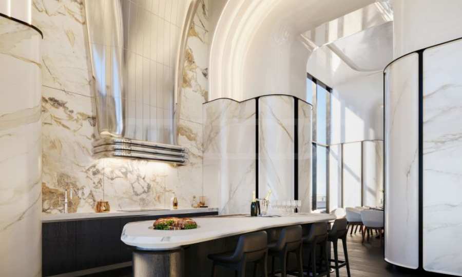 Projekt kuchni został opracowany przez pracownię Woods Bagot, która połączyła różne naturalne materiały, w tym: