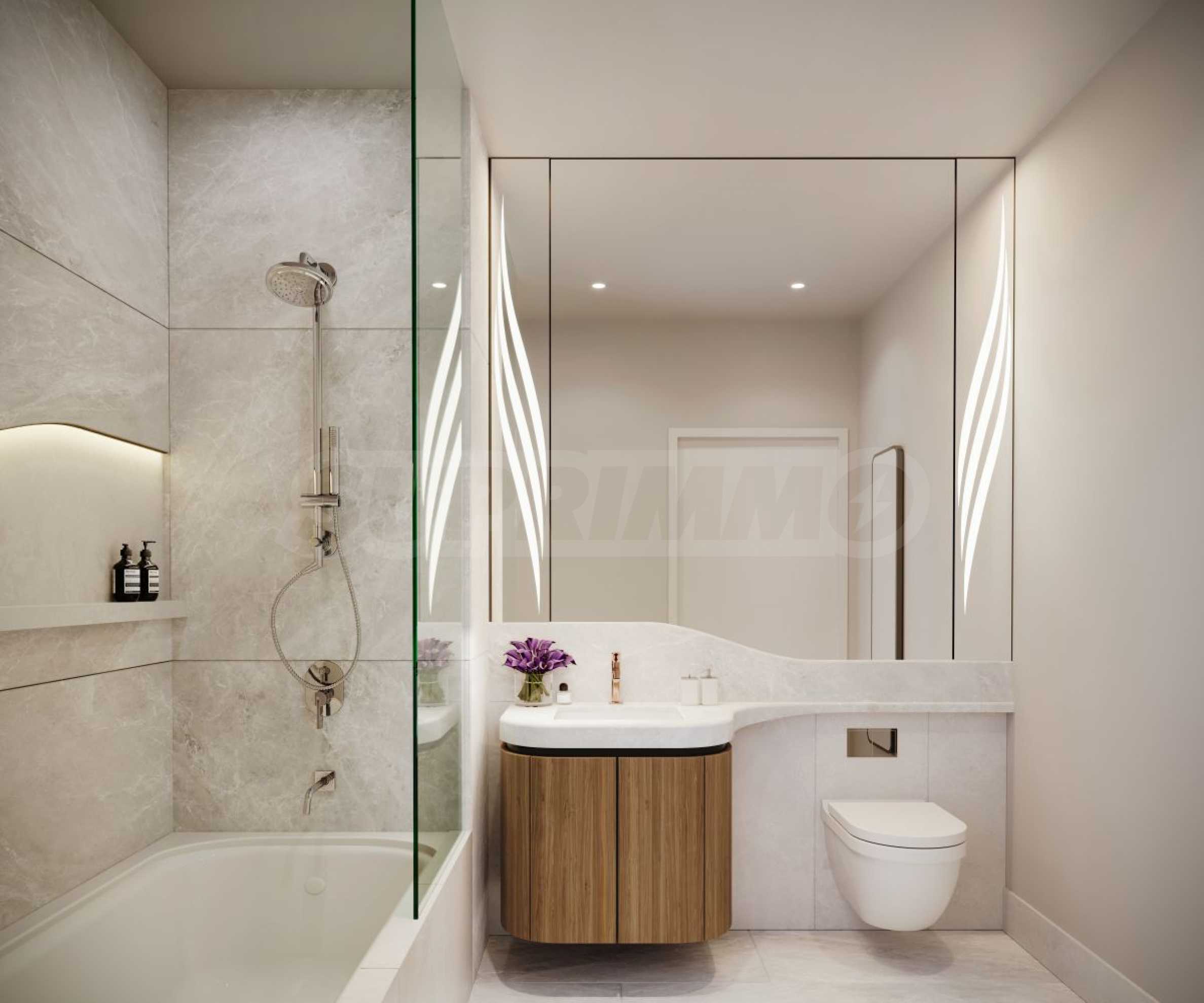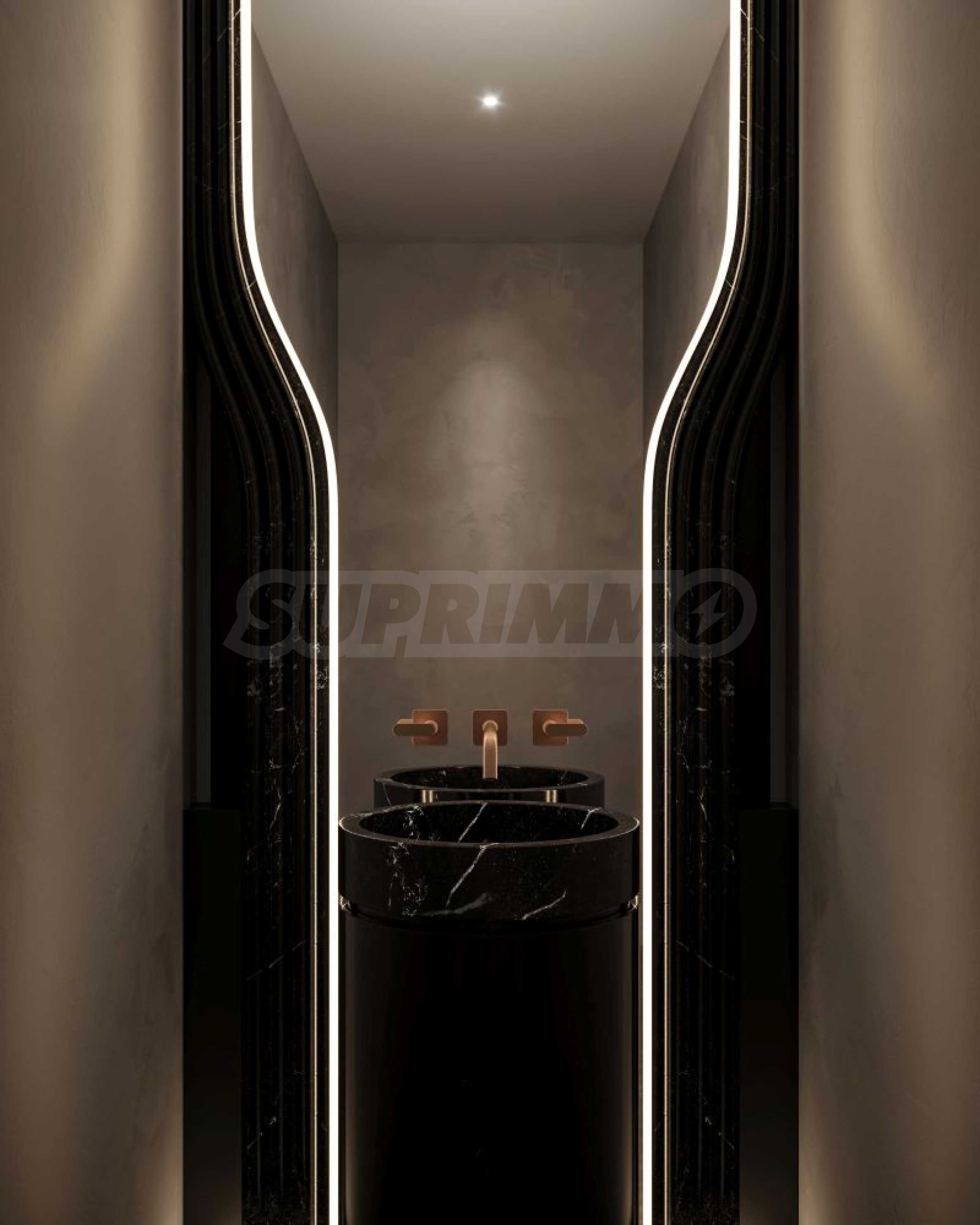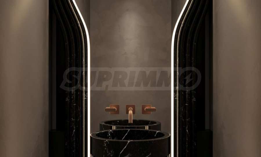 - Czarny lub biały kamienny prysznic z całkowicie zintegrowanym systemem deszczownicy i oświetloną wnęką;