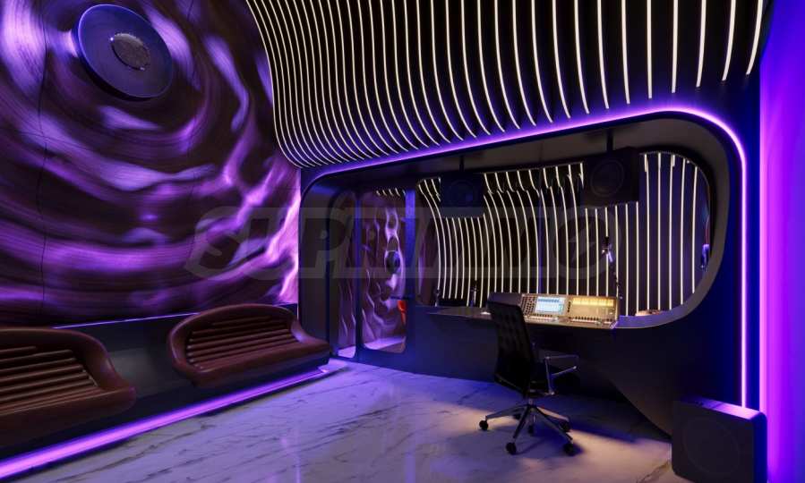 - Czarny lub biały kamienny prysznic z całkowicie zintegrowanym systemem deszczownicy i oświetloną wnęką;