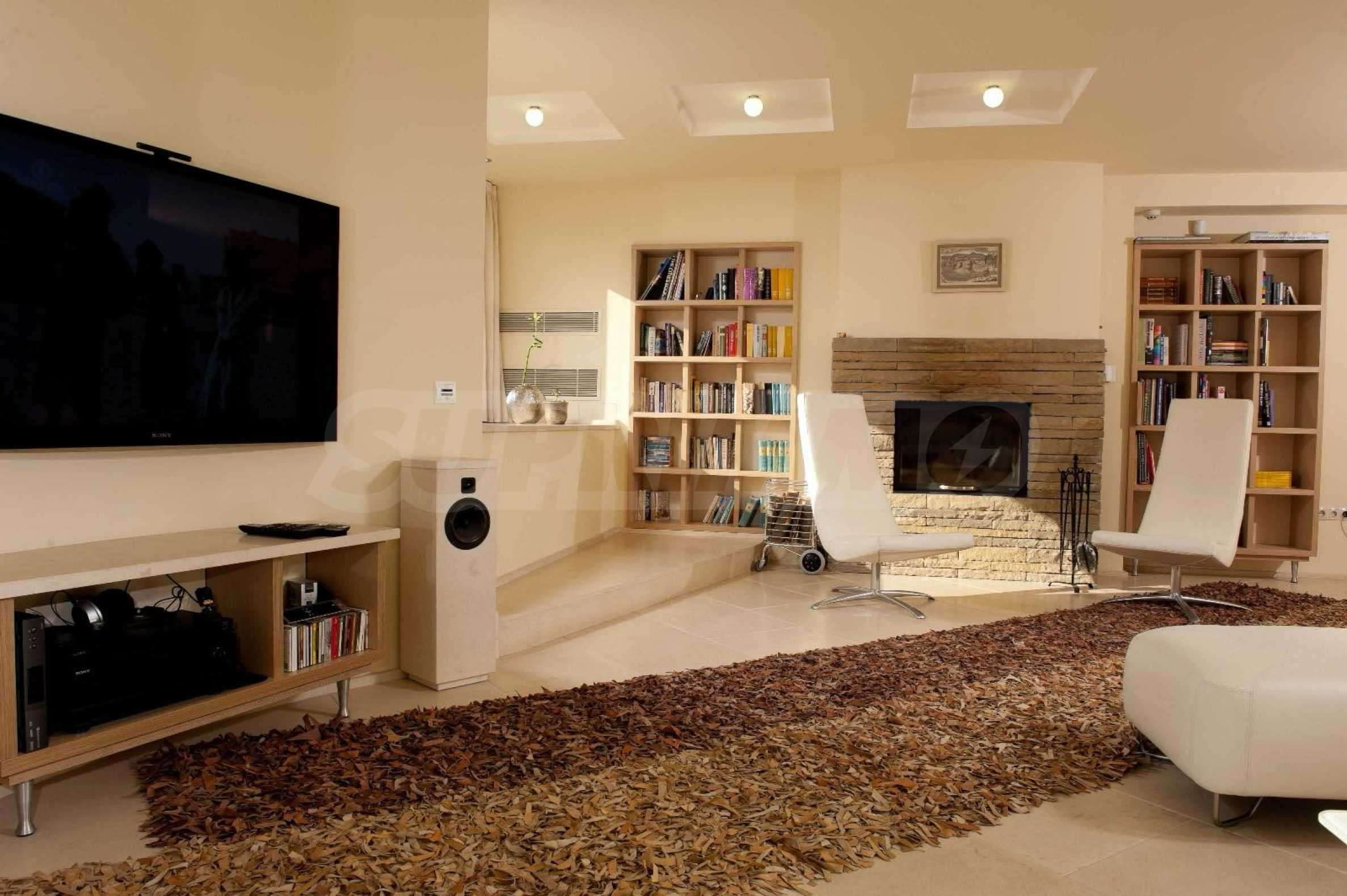 Apartament jest w pełni umeblowany według indywidualnego projektu, charakteryzuje się funkcjonalnym wnętrzem i ciepłą aranżacją, podkreślającą przestrzeń apartamentu. Podłogi w pokojach wykonane są z naturalnego szwajcarskiego parkietu, a łazienki z naturalnego kamienia.
