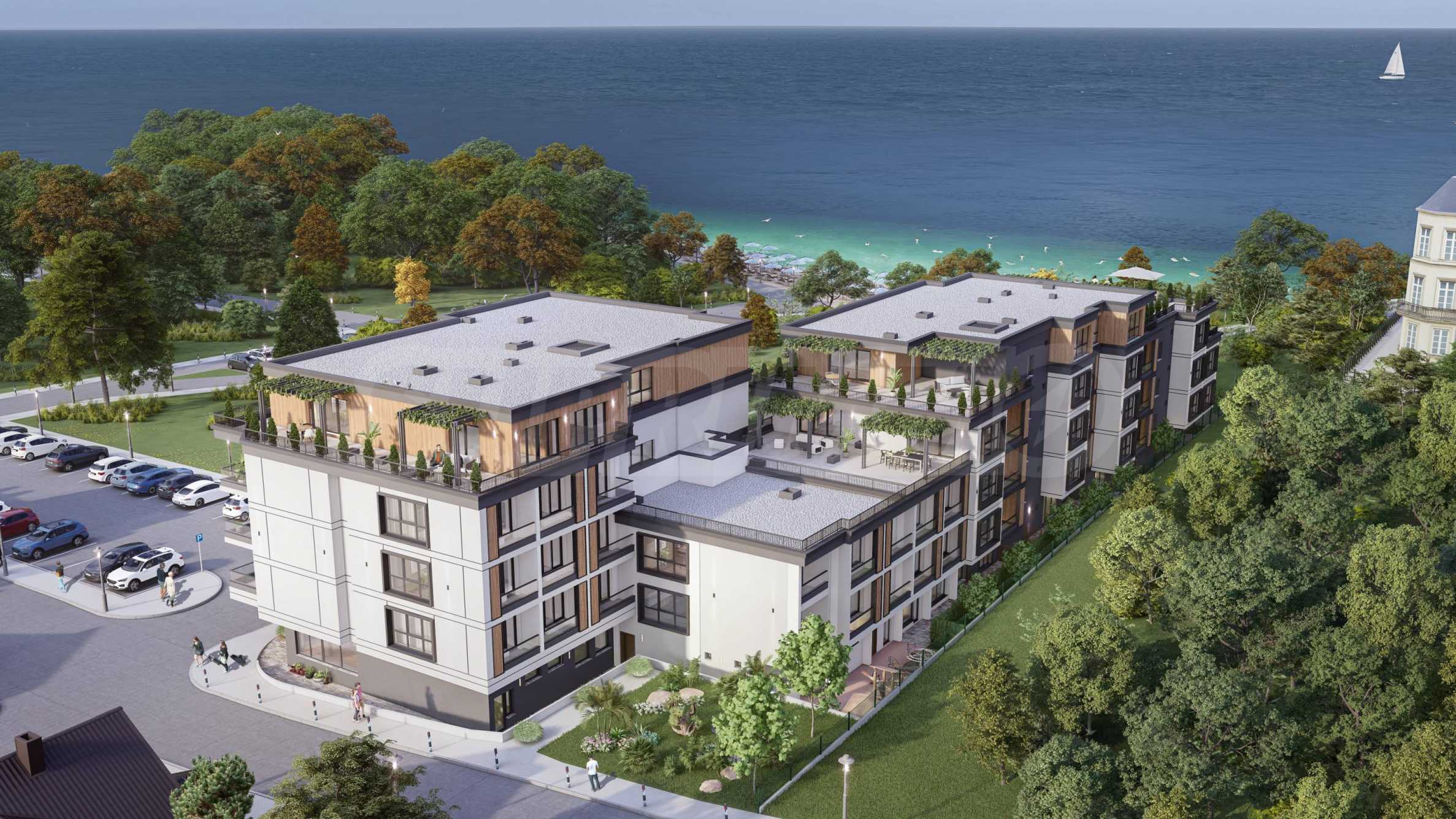 Budynki wyróżniają się eleganckim i nowoczesnym wyglądem. Połączenie elewacji z płyt HPL, etalbond i tynków mineralnych tworzy wrażenie przytulności i komfortu. Apartamenty to studia, apartamenty z jedną lub trzema sypialniami o powierzchni od 47,15 m2 do 120 m2 z malowniczym widokiem na morze i plażę.