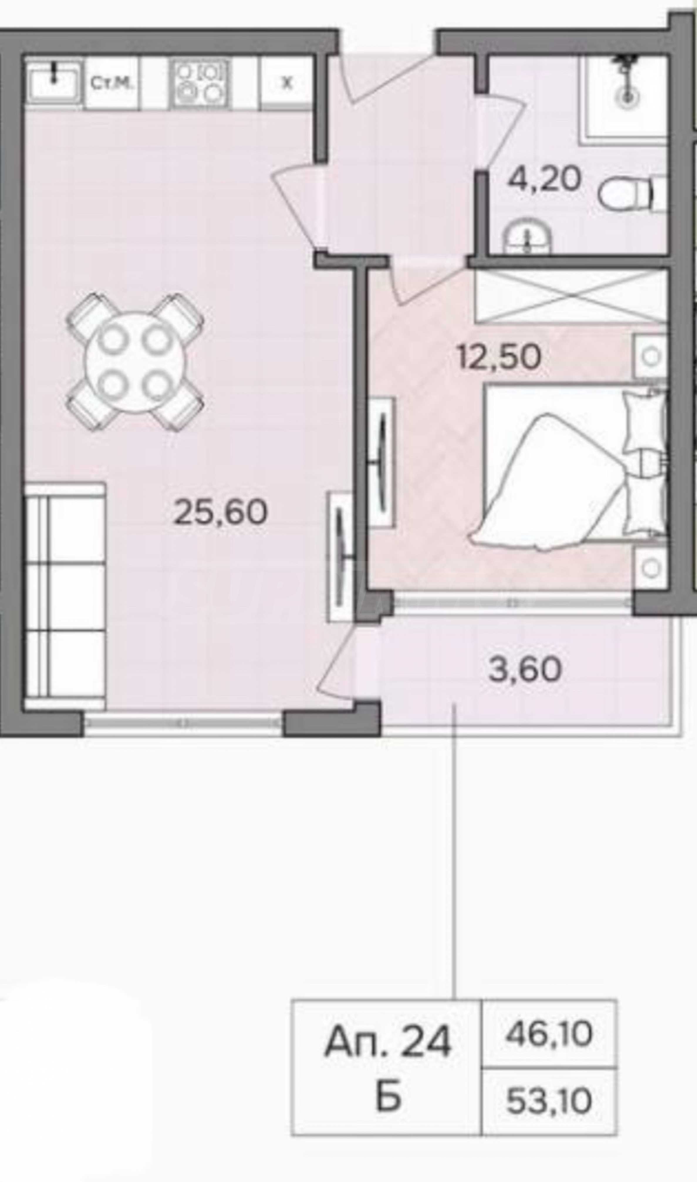 Mieszkanie o powierzchni całkowitej 53 m2 znajduje się na 5 piętrze z 7 i ma następujący układ: