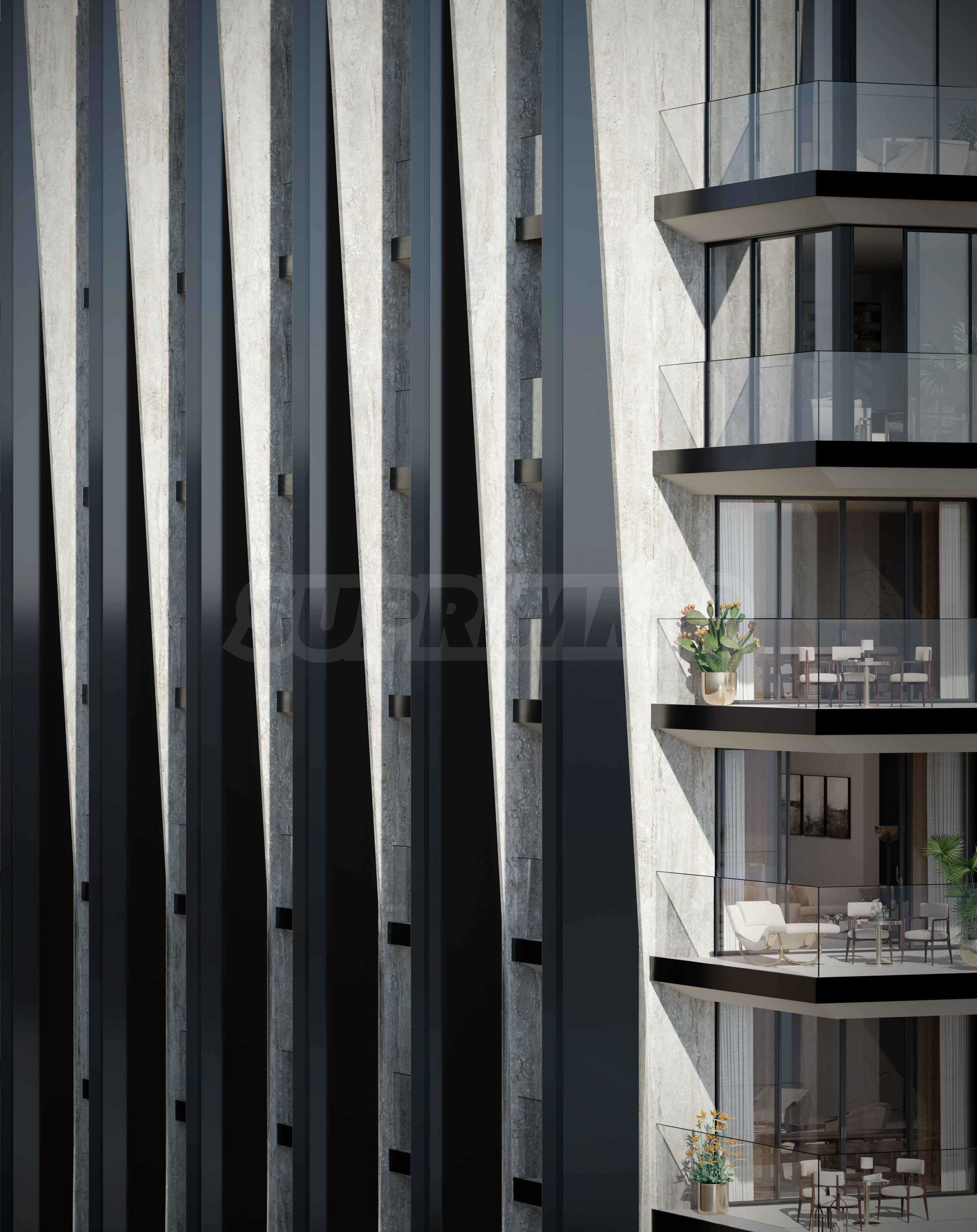 Fasada łączy okładzinę z trawertynu ze złotymi elementami i czarnym lustrzanym szkłem, tworząc niezwykle rozpoznawalną i elegancką sylwetkę. Dach wieży jest niczym wykończenie dzieła sztuki – błyszczący, artystyczny i imponujący.