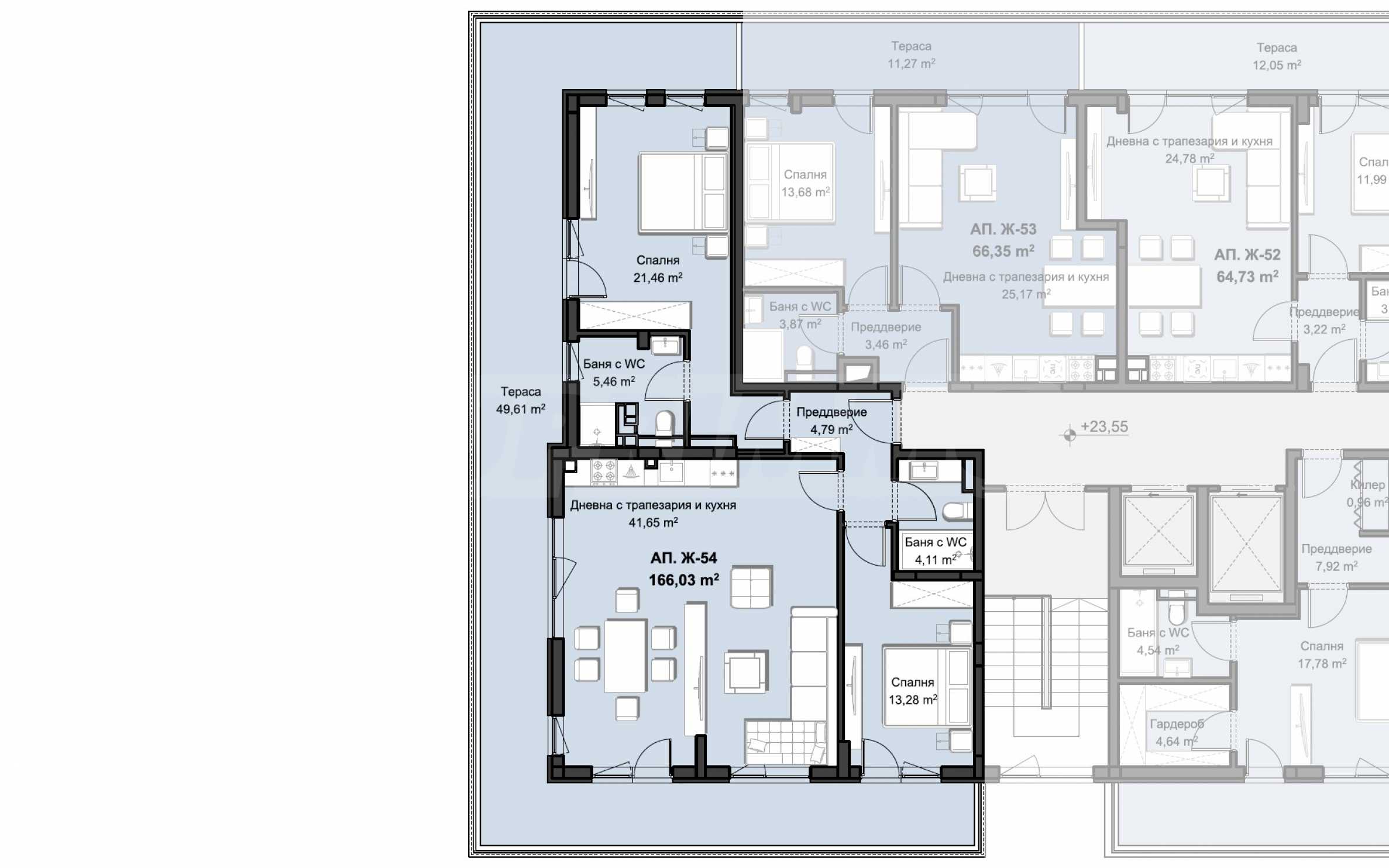 Mieszkania są oddawane w stanie wykończonym zgodnie z bułgarskimi normami budowlanymi, z tynkiem i wylewką.
