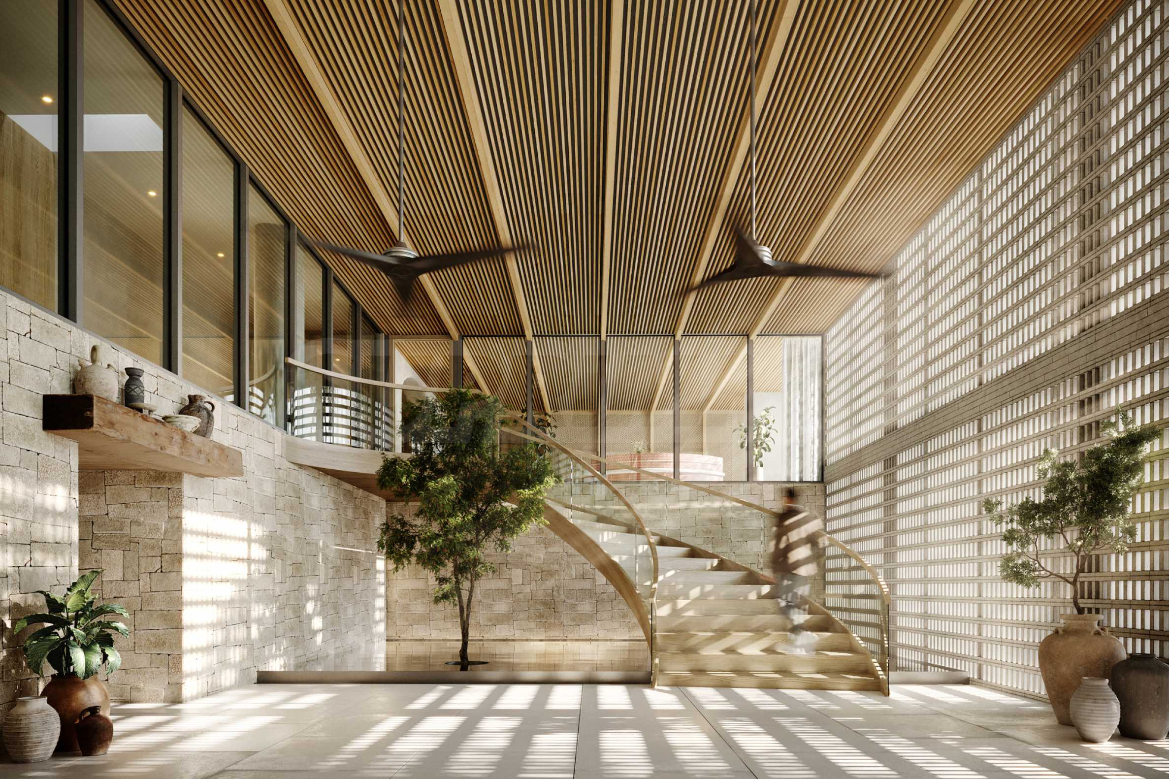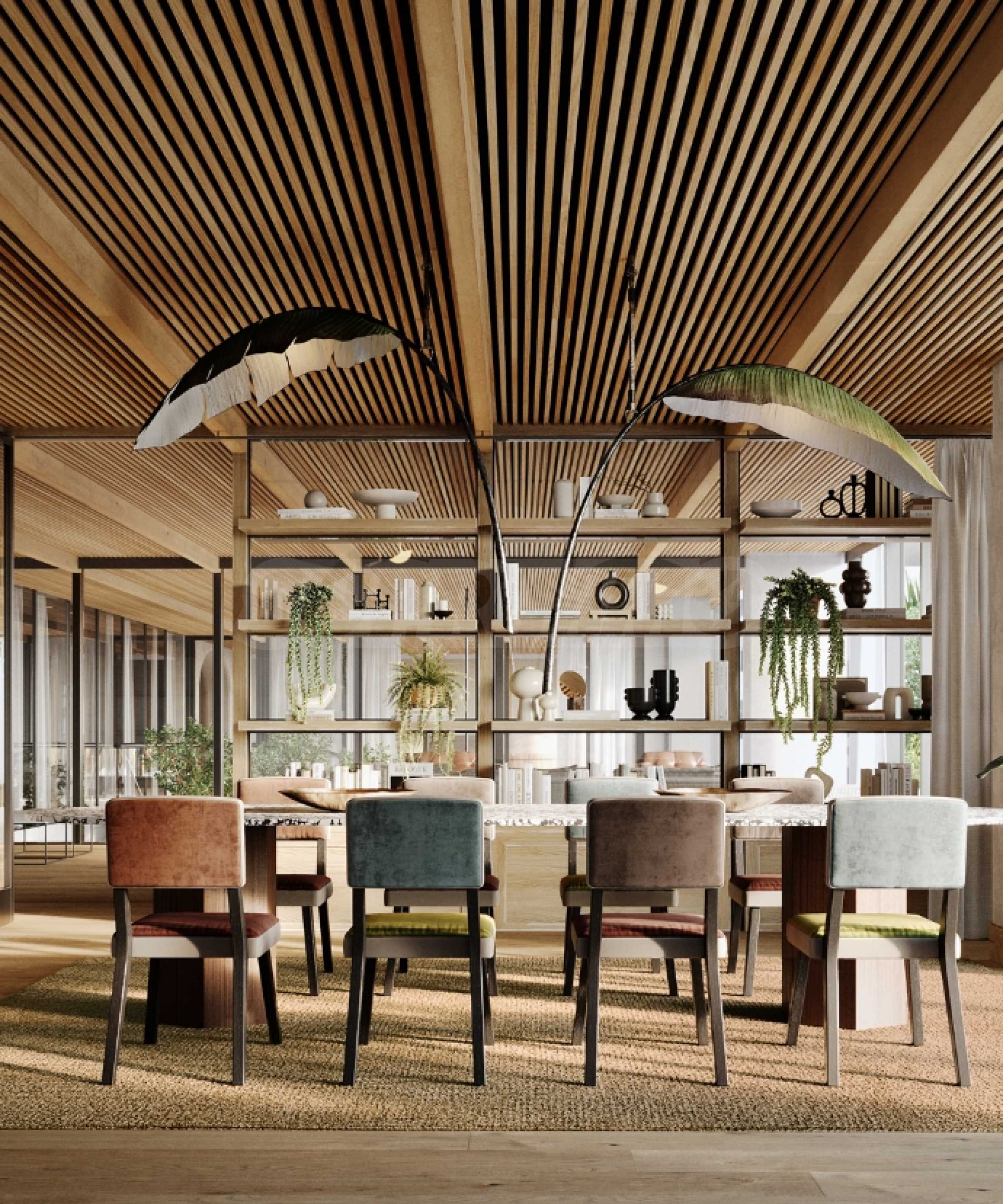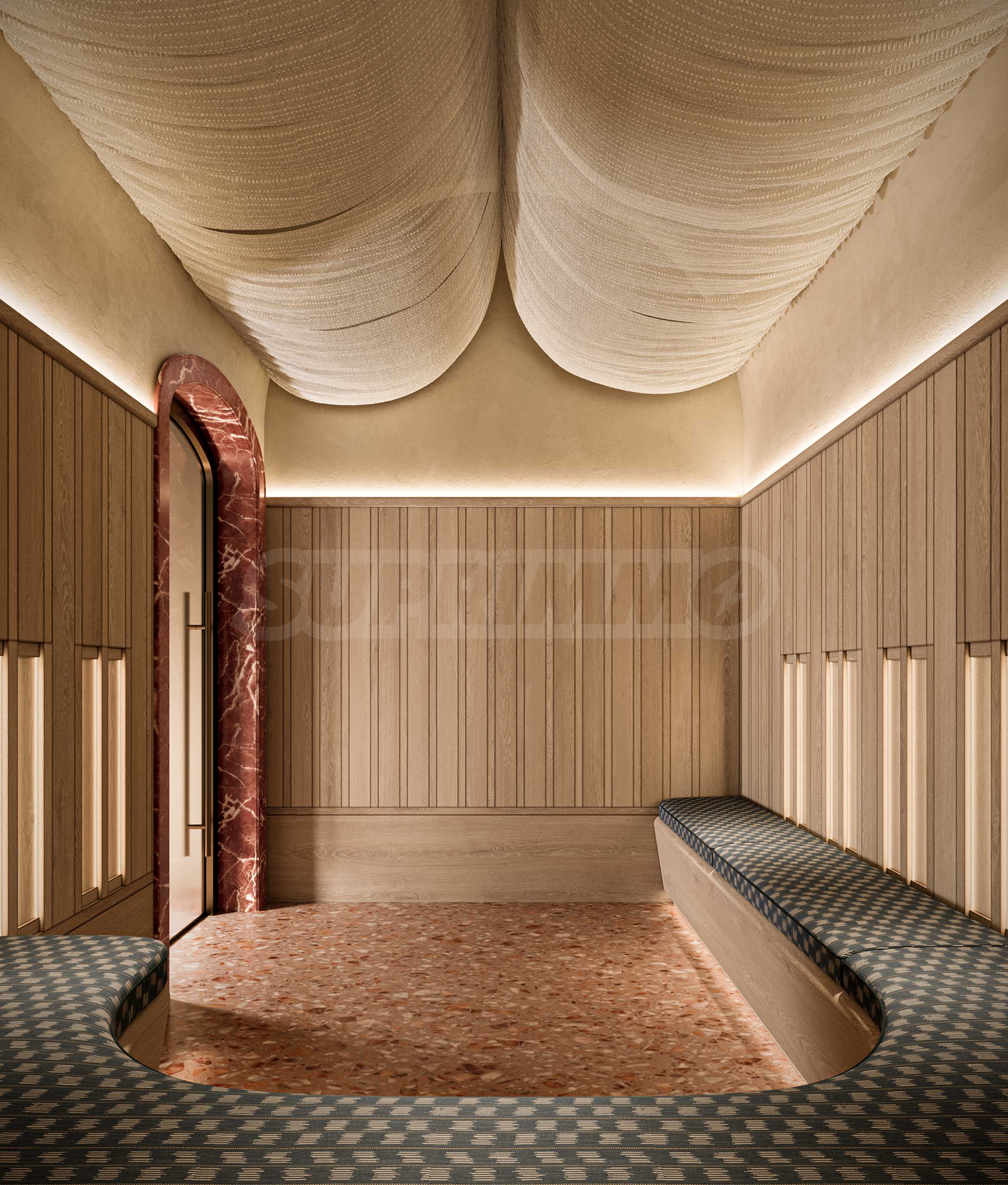 Za wystrój wnętrza lobby, pokoi i części wspólnych odpowiada firma projektowa Meyer Davis, która wykorzystała naturalne materiały, takie jak drewno, kamień i marmur, tworząc elegancką i spokojną atmosferę łączącą budynek mieszkalny z naturą. Te ziemskie elementy nie tylko dodają piękna wizualnego, ale także dają poczucie uziemienia i komfortu.