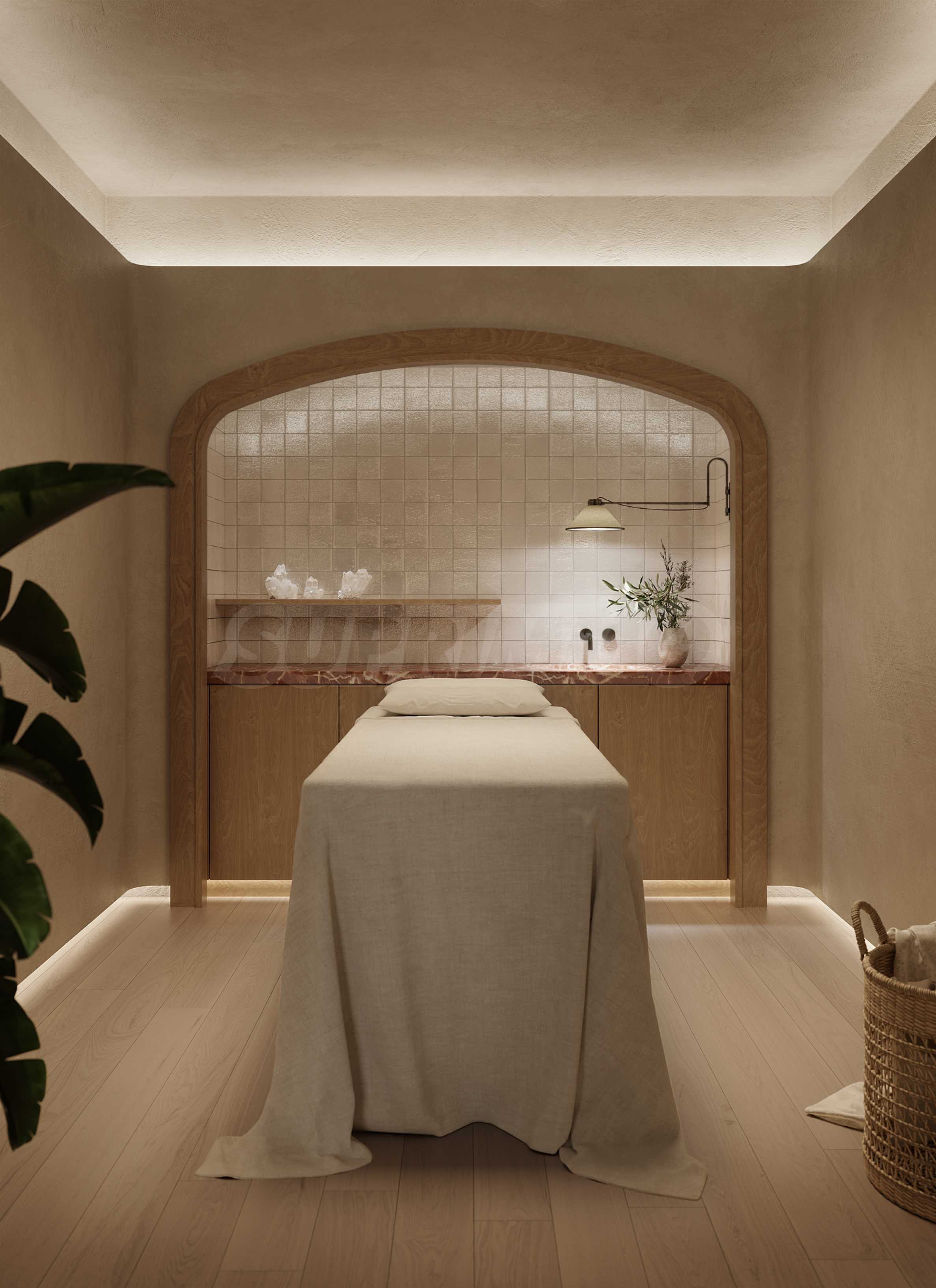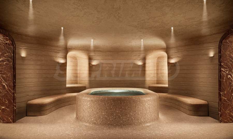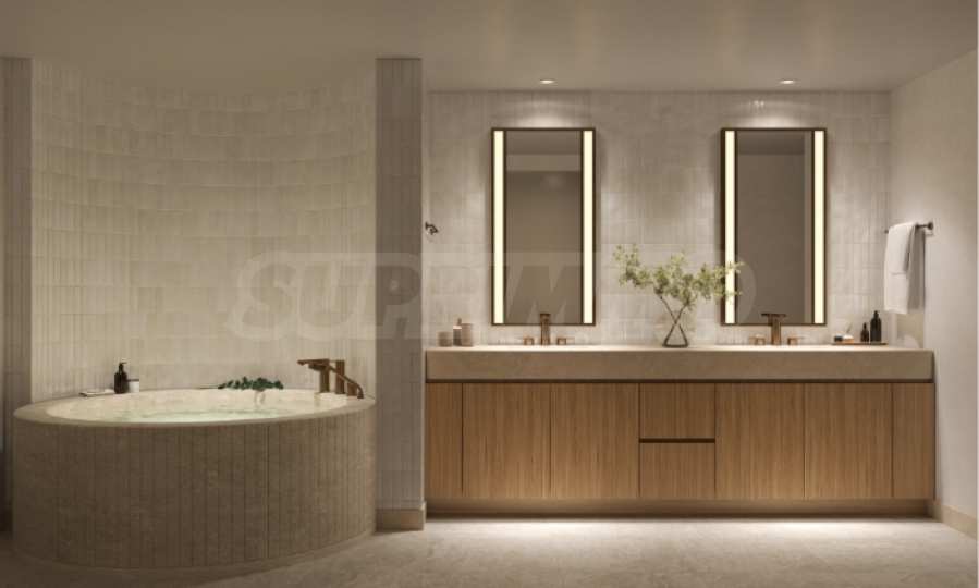 Łazienka główna została zaprojektowana tak, aby odtworzyć zabiegi spa z deszczownicami o podwójnym ciśnieniu i możliwością skorzystania z prysznica spa z hydromasażem, który stymuluje układ limfatyczny i dodaje energii. Wolnostojące lub wbudowane wanny, kamienne podłogi i ściany tworzą chłodną i orzeźwiającą atmosferę, zmieniając łazienkę w miejsce prawdziwej regeneracji.