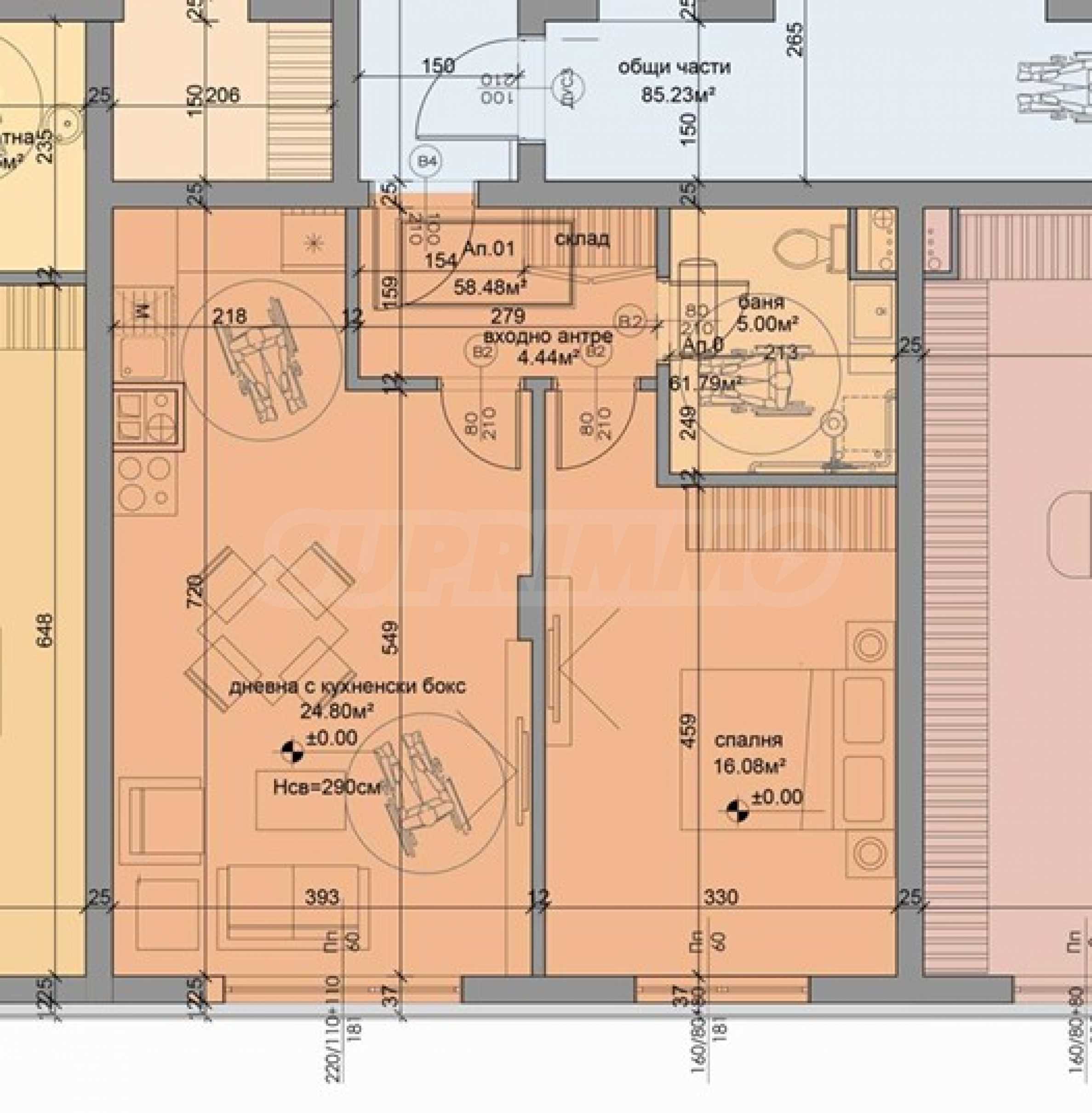 Nieruchomość znajduje się na parterze i ma powierzchnię całkowitą 69,59 mkw. Jest oferowana w stanie ukończonym zgodnie z bułgarskimi standardami budowlanymi. Składa się z przedpokoju, pomieszczenia gospodarczego, salonu z aneksem kuchennym, sypialni i łazienki.