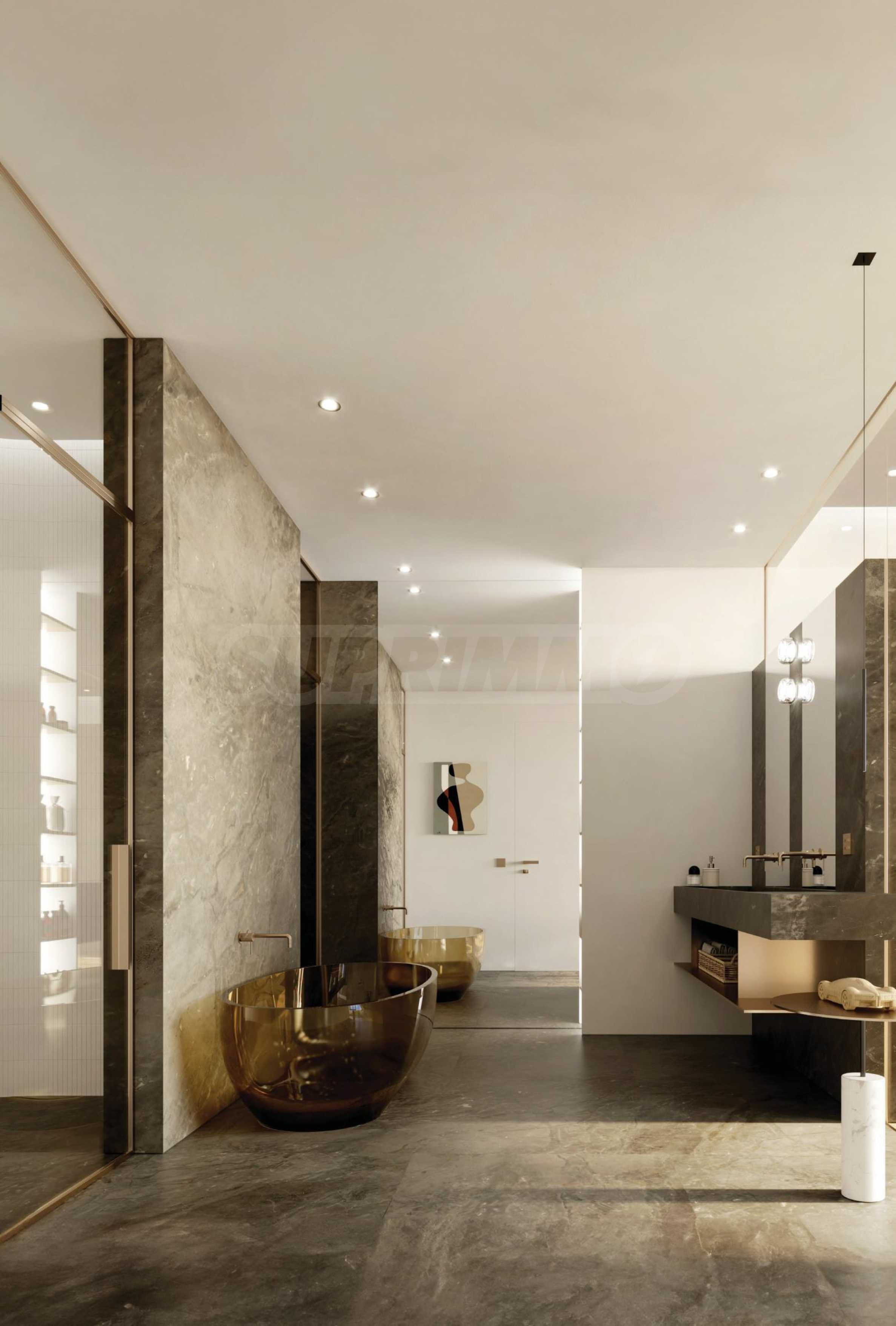 Projekt wnętrz wykonała pracownia Pininfarina, która wcieliła w życie swoją niepowtarzalną wizję przestrzeni w budynku. Apartament został wyposażony w najwyższej jakości materiały wykończeniowe, sprowadzane bezpośrednio z Europy – od wykwintnych marmurów po precyzyjnie obrobione drewno dębowe, dzięki czemu każda powierzchnia emanuje elegancją i najwyższym kunsztem wykonania. Indywidualnie zaprojektowane detale i wysokiej jakości elementy nie tylko podkreślają efekt wizualny, ale także zapewniają optymalną funkcjonalność i komfort, odzwierciedlając głębokie zrozumienie wyrafinowanego stylu życia. Sprzęty AGD w kuchni pochodzą od Miele, jednej z wiodących marek na świecie w tej branży. W każdym apartamencie znajdują się oczyszczacze powietrza i wody, a w łazienkach ogrzewanie podłogowe.