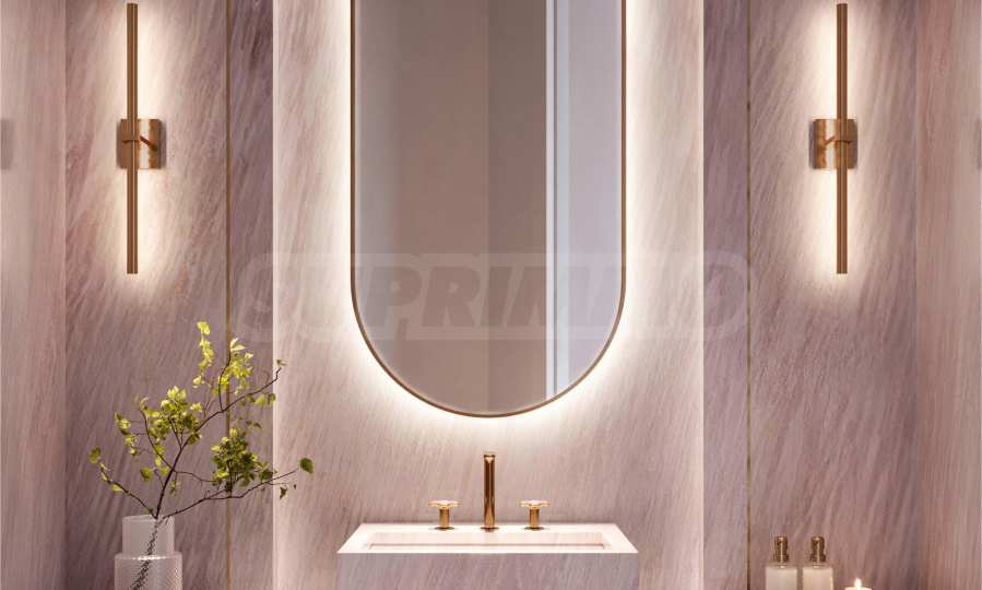 Podłogi i ściany wyłożono ekskluzywnym marmurem Covelano Silver Gold, znanym z delikatnego wzoru w odcieniach srebra, złota i bursztynu — detal ten tworzy poczucie przepychu i ciepła.