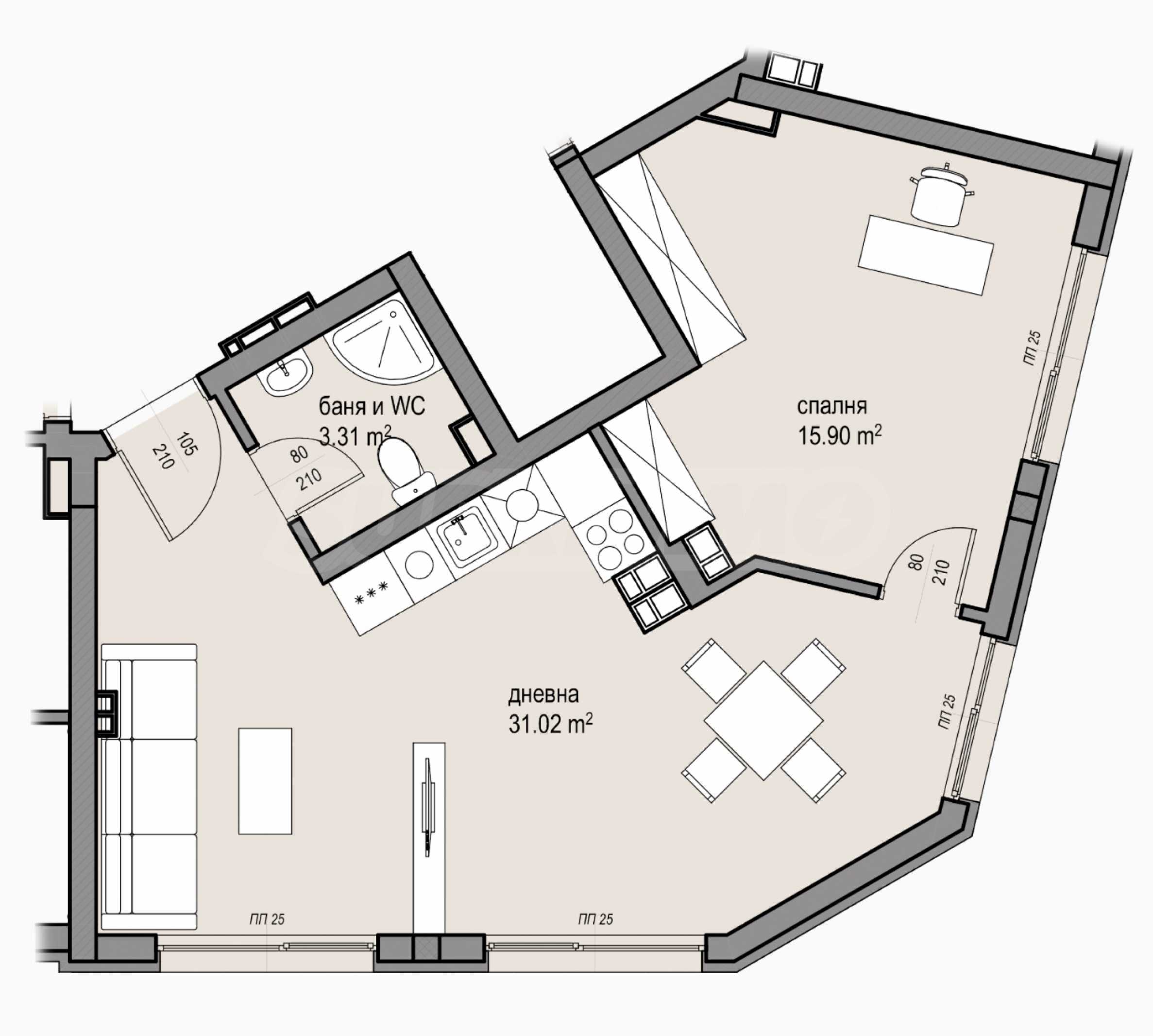 Prezentuję Państwu mieszkanie z jedną sypialnią w nowo wybudowanym budynku w dzielnicy Malinova Dolina. Budynek został zaprojektowany z myślą o Państwa komforcie. Mieszkanie ma powierzchnię netto 58,51 m2, osiągając 77,15 m2 z częściami wspólnymi. Rozkład jest następujący: salon z aneksem kuchennym, sypialnia i łazienka z toaletą. Ekspozycja południowa. Cena wynosi 188 870 euro z VAT, a schematy płatności są indywidualne.