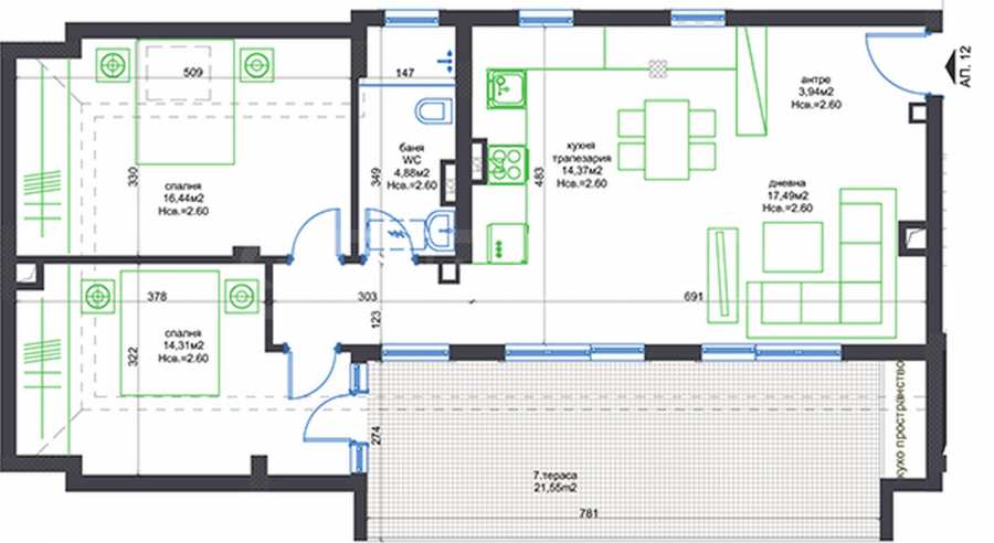Mieszkanie jest wynajmowane w stanie wykończonym zgodnie z bułgarskim kodeksem budowlanym.