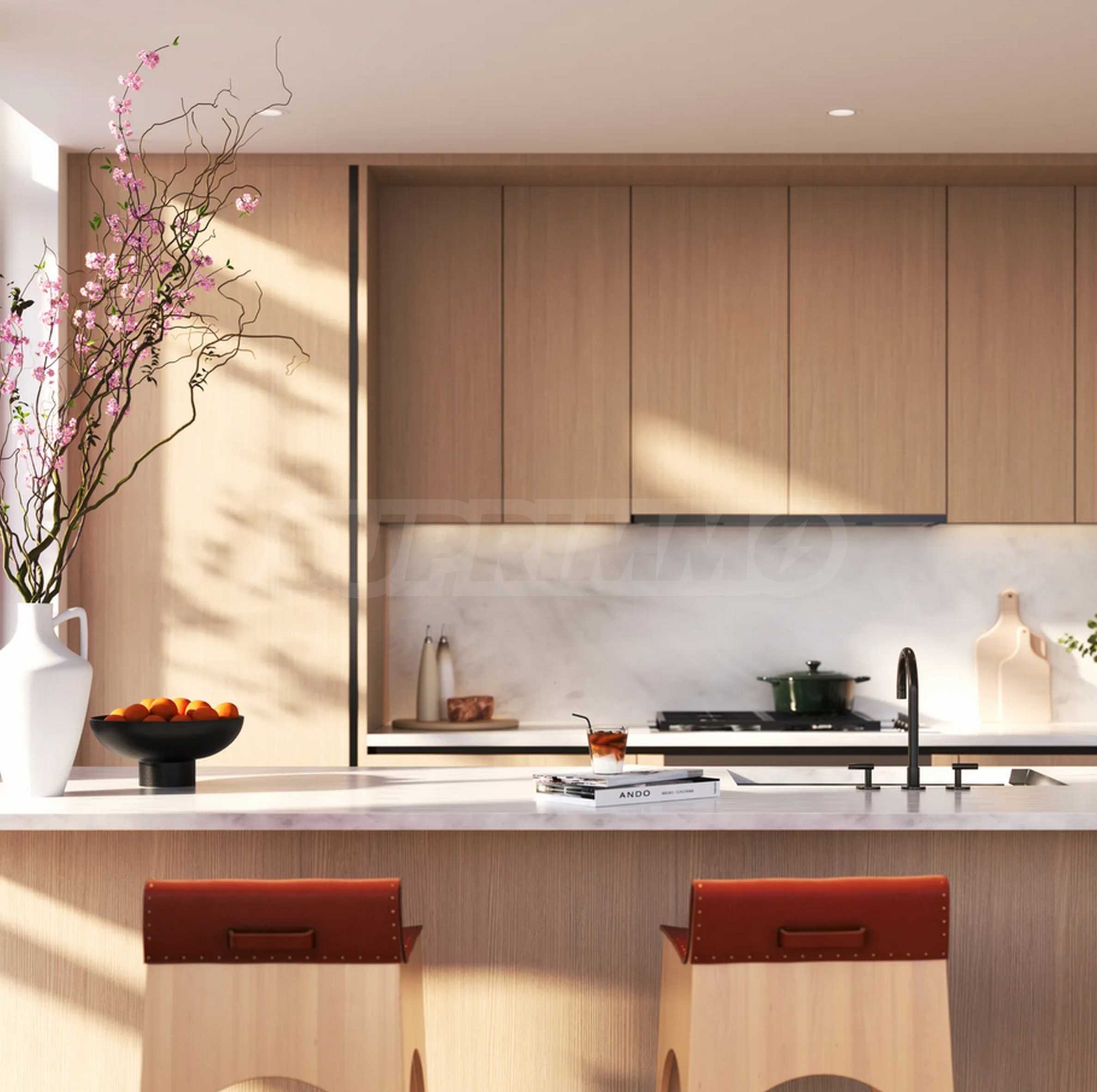 Wejście prowadzi do otwartego salonu z jadalnią i kuchnią z ekspozycją na południe i wschód. Kuchnia łączy organiczne odcienie i eleganckie krzywizny, tworząc nowoczesną i stylową przestrzeń do codziennego użytku. Wyposażona jest w polerowane blaty i panele przeciwbryzgowe Calacatta Gold Quartz, niestandardowe szafki, utylizator odpadów InSinkerator, matowoczarny kran Waterworks ze zdejmowaną wylewką i wysokiej klasy wbudowane urządzenia Miele.