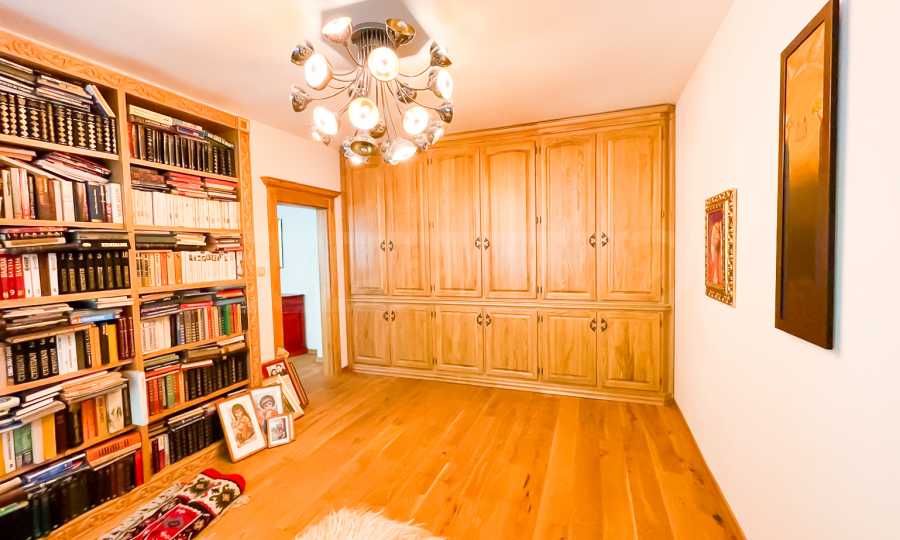 Wszystkie meble zaprojektowano na zamówienie, z litego drewna dębowego, łącznie z dużymi szafami wnękowymi, wbudowaną biblioteczką i pianinem.