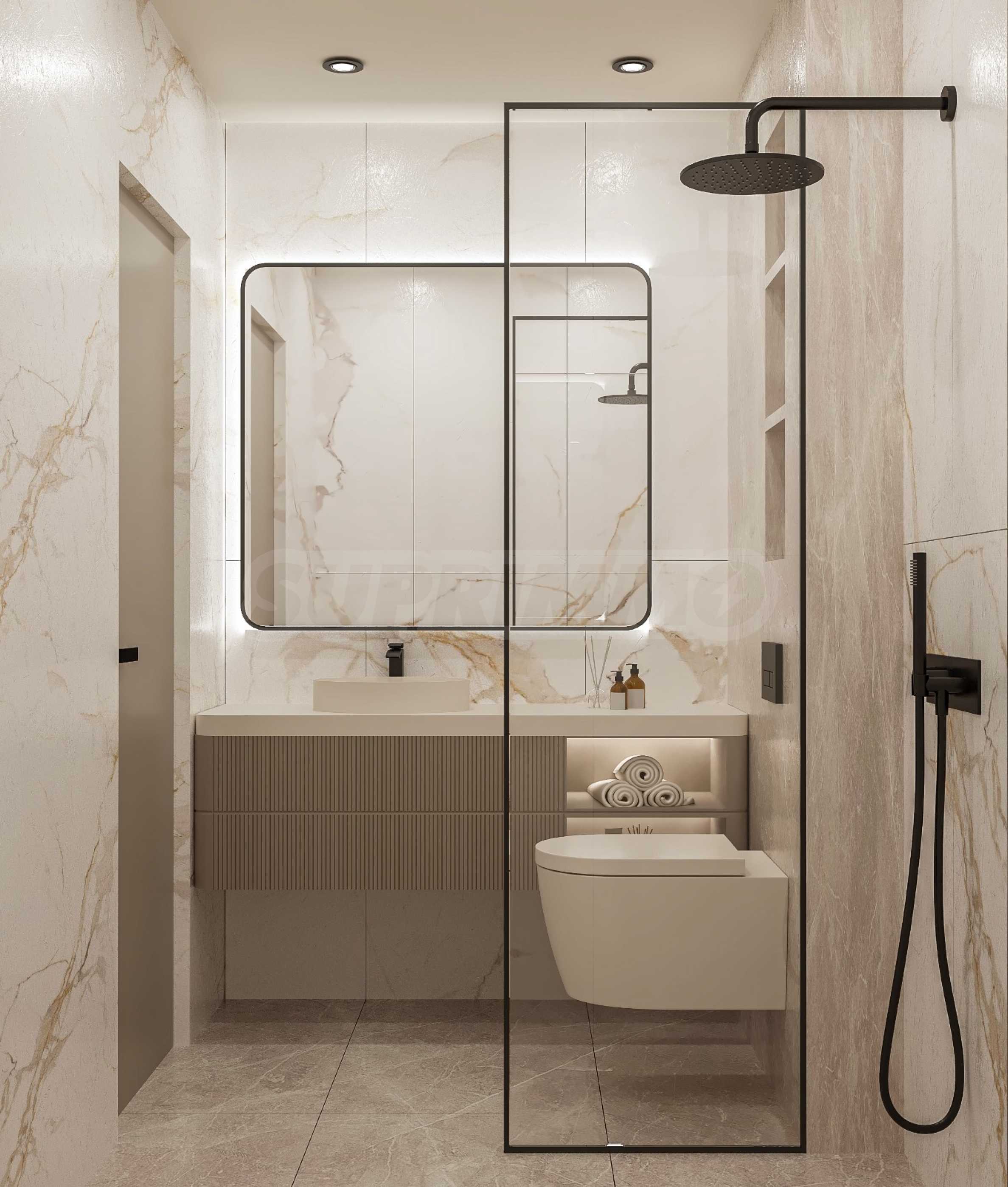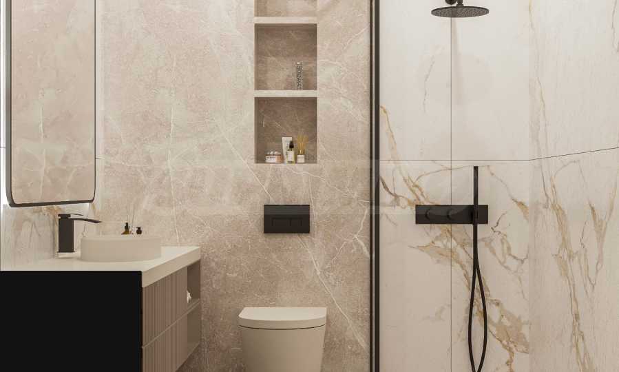• Podłogi i ściany jednej z łazienek wyłożone są włoskimi płytkami gresowymi o formacie 120×60 cm, o przyczepności R10 (A+B) zgodnie z normą DIN 51130 i nasiąkliwości <0,1%, co gwarantuje higienę, odporność na mróz i duże natężenie ruchu;