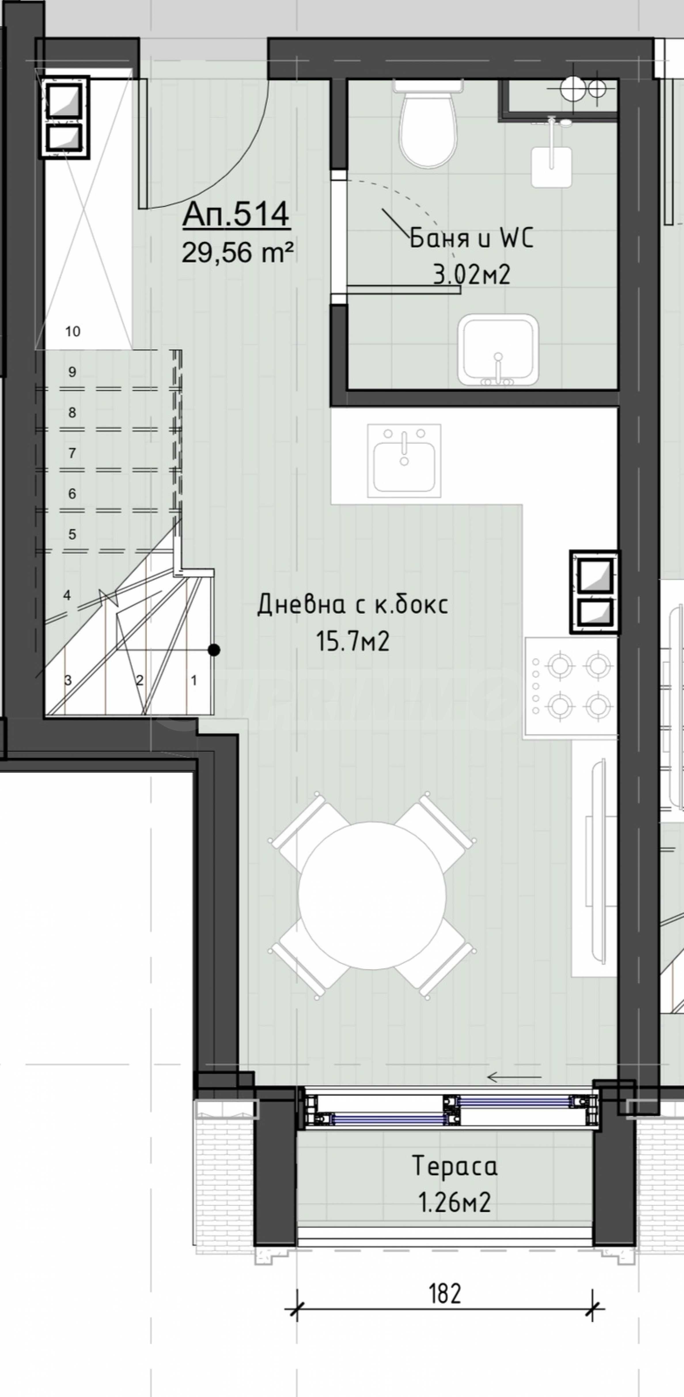 Apartament o powierzchni całkowitej 29,56 mkw. znajduje się na 5 piętrze z 5, z widokiem na morze i ma następujący układ: