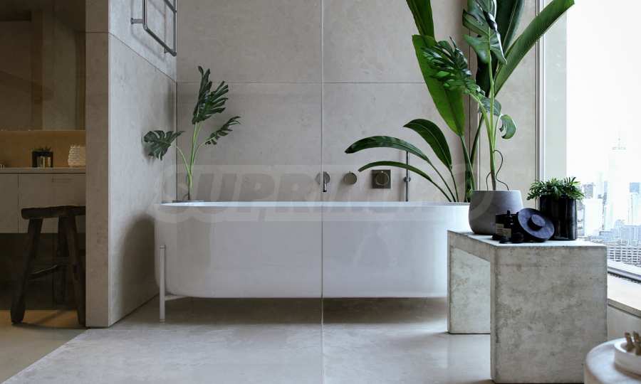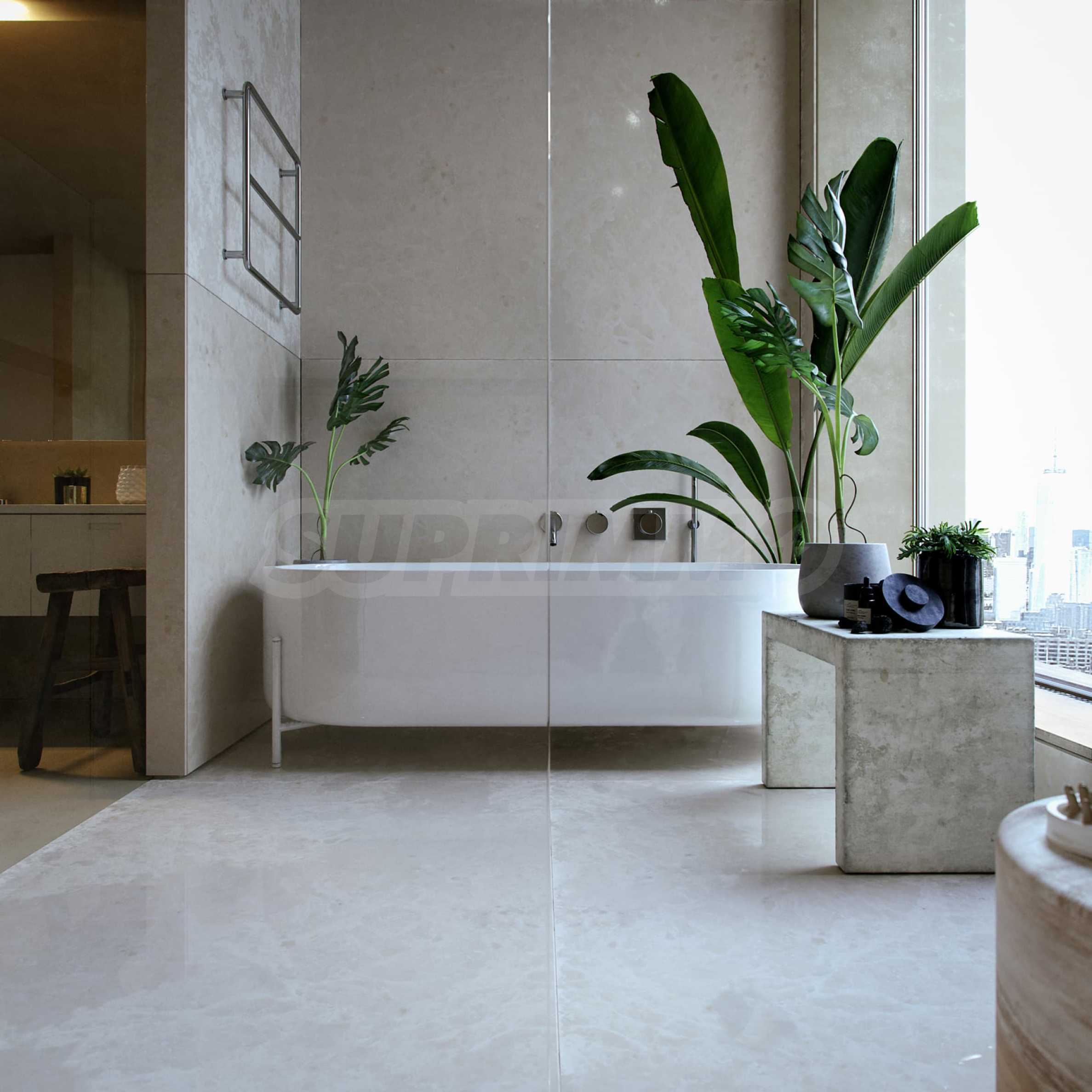 W głównej łazience znajduje się marmurowa podłoga i płytki Vanilla Ice, połączone z meblami Boffi Programma Standard w matowym lakierze. Baterie Fantini, zaprojektowane przez Fukasawę, wykonane są z polerowanej stali nierdzewnej i uzupełnione są termostatycznymi deszczownicami – połączenie, które sprawia, że każda wizyta w łazience staje się przyjemnością dla zmysłów.