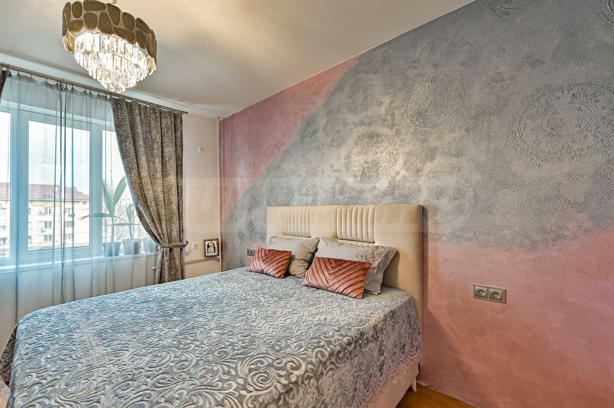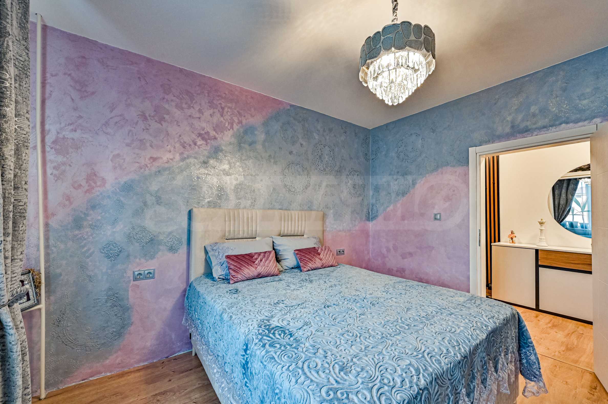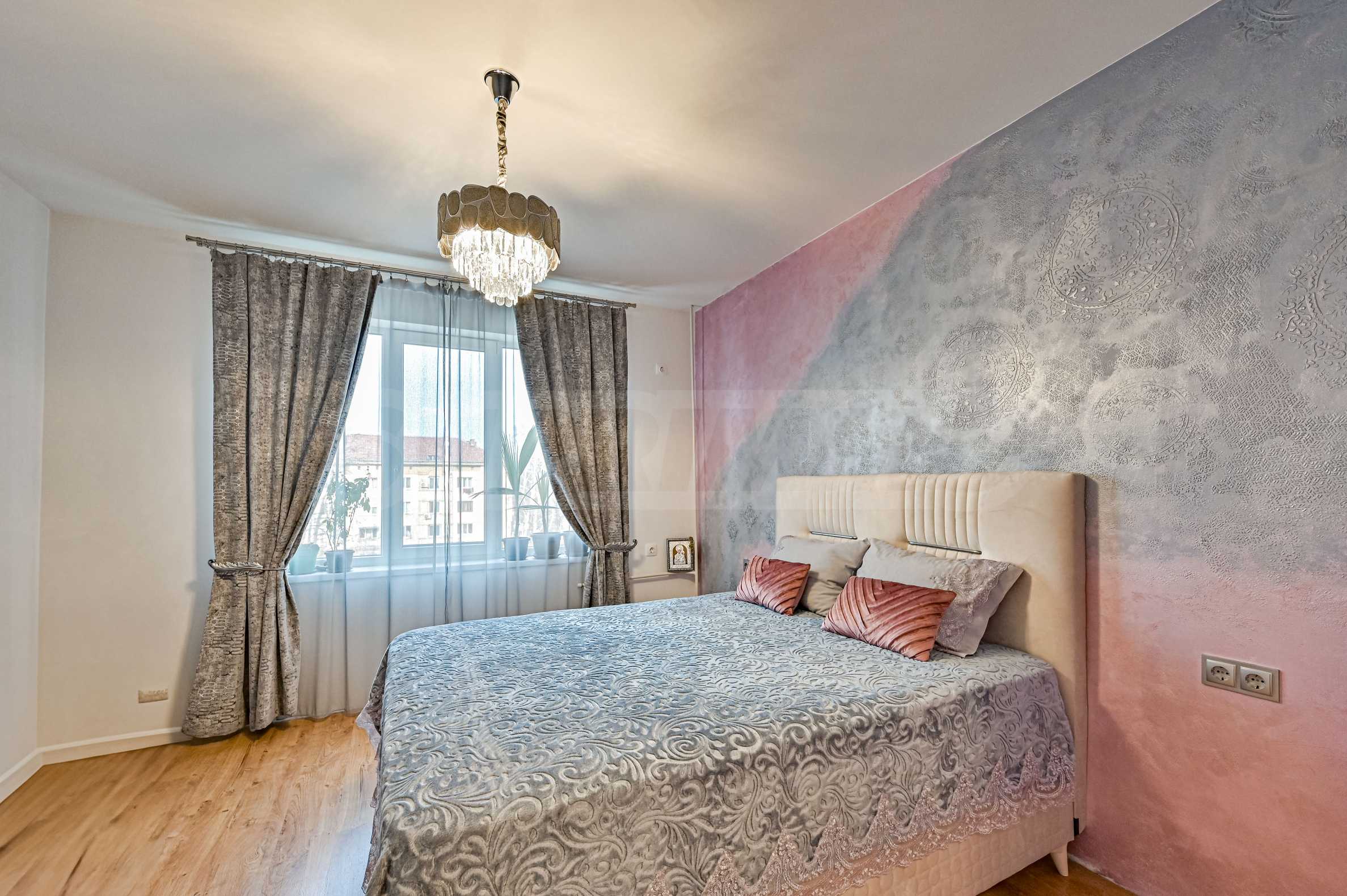 Sypialnia główna – komfort i luksus w pastelowych odcieniach różu i srebra, akcenty tynkowe i nowoczesne oświetlenie z kryształowym żyrandolem.