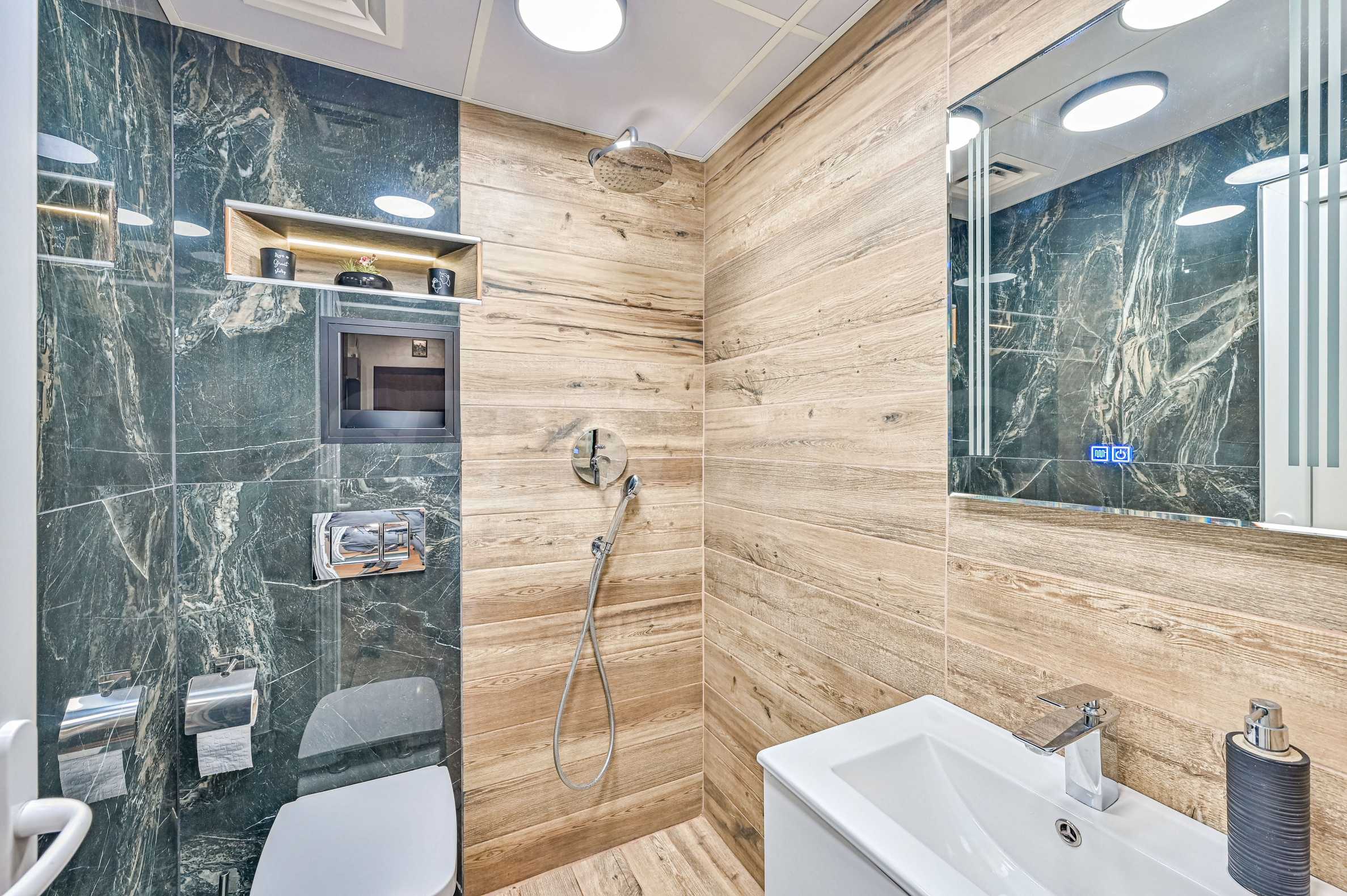 Nowoczesna łazienka łącząca marmur z efektem drewna.