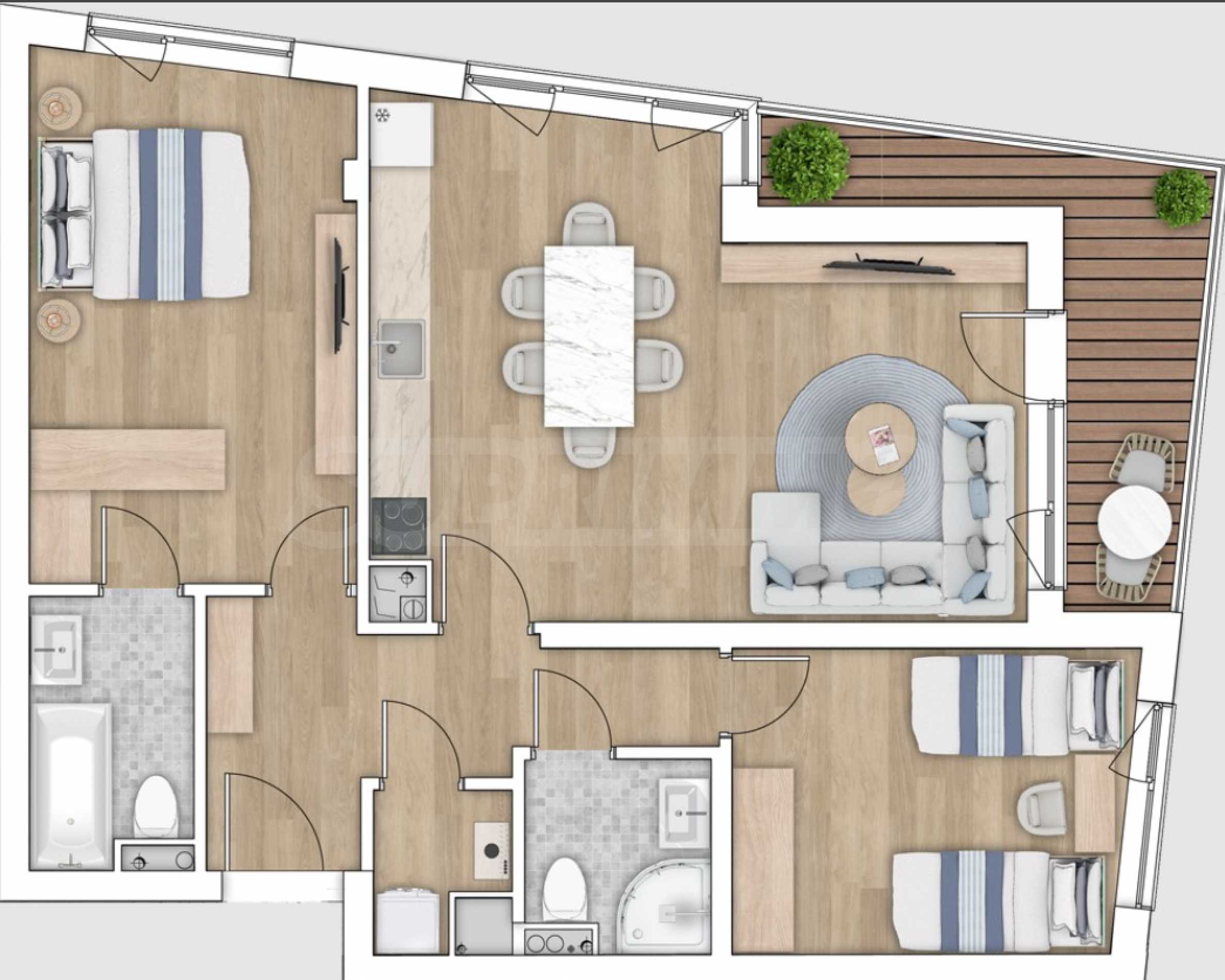 Rozkład mieszkania obejmuje salon, dwie sypialnie, dwie łazienki z toaletą i taras.