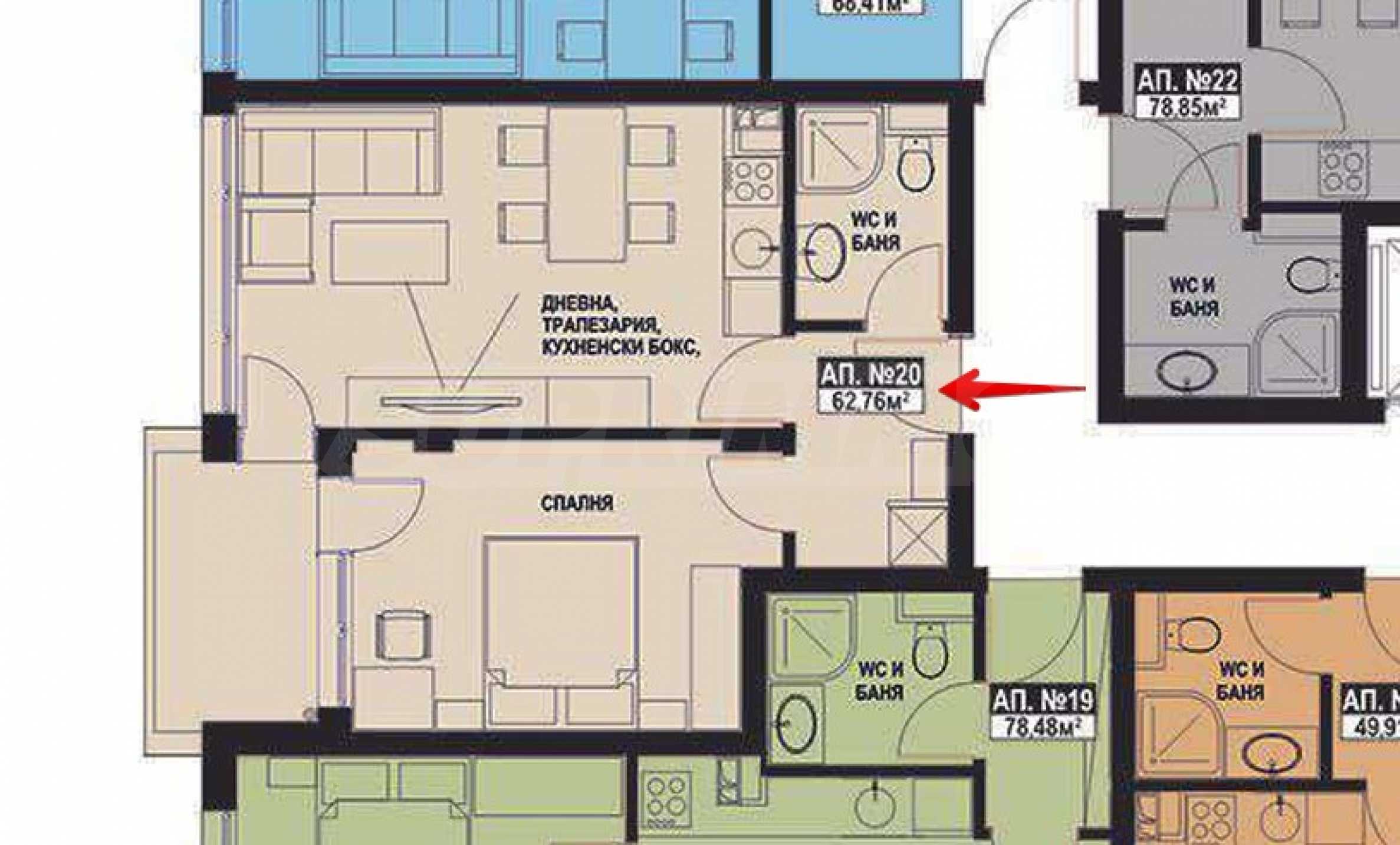 Mieszkanie ma powierzchnię całkowitą 62,76 mkw, znajduje się na 2 piętrze.
