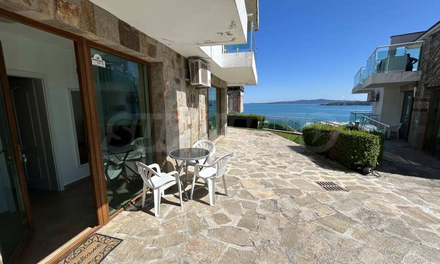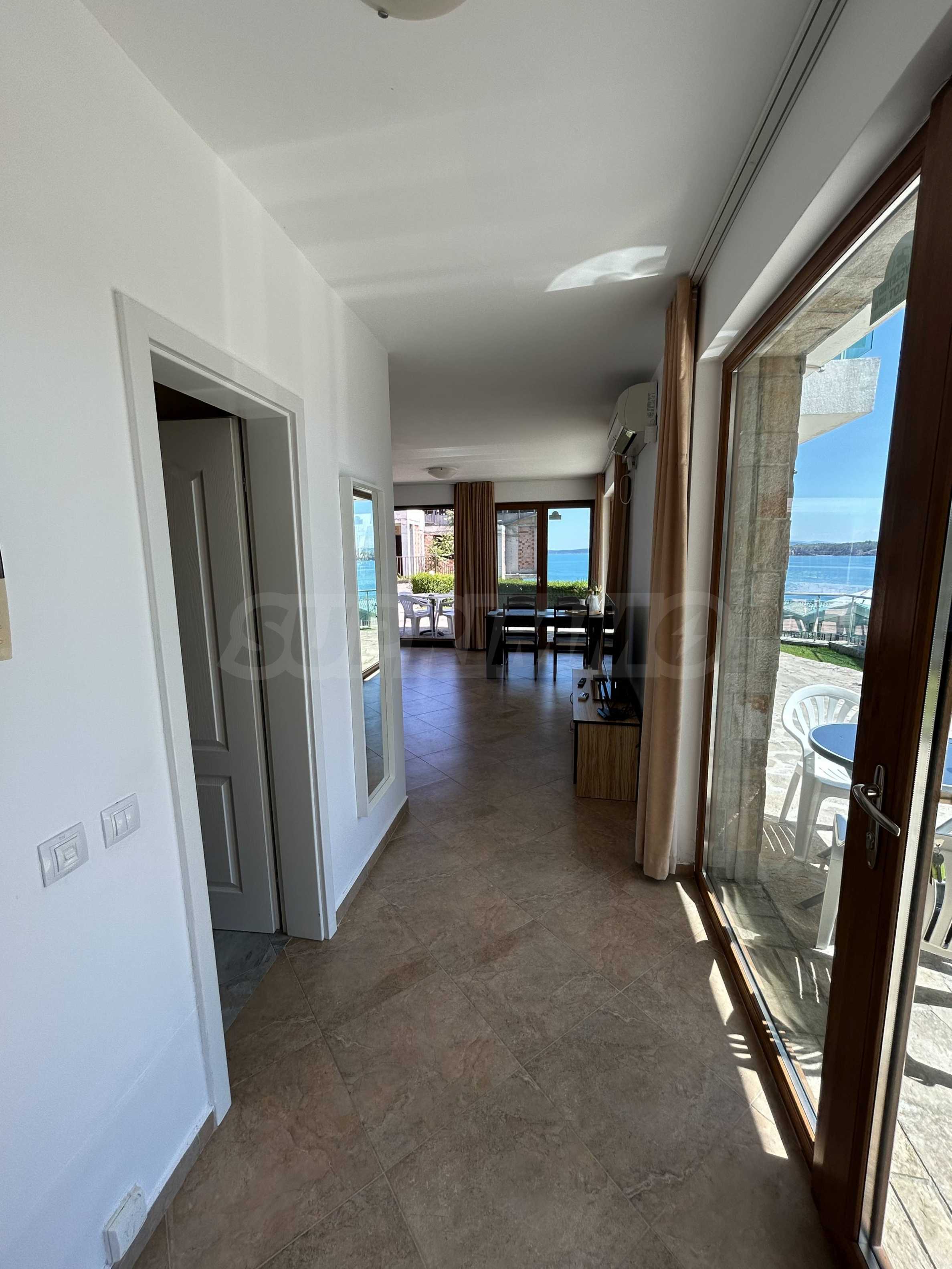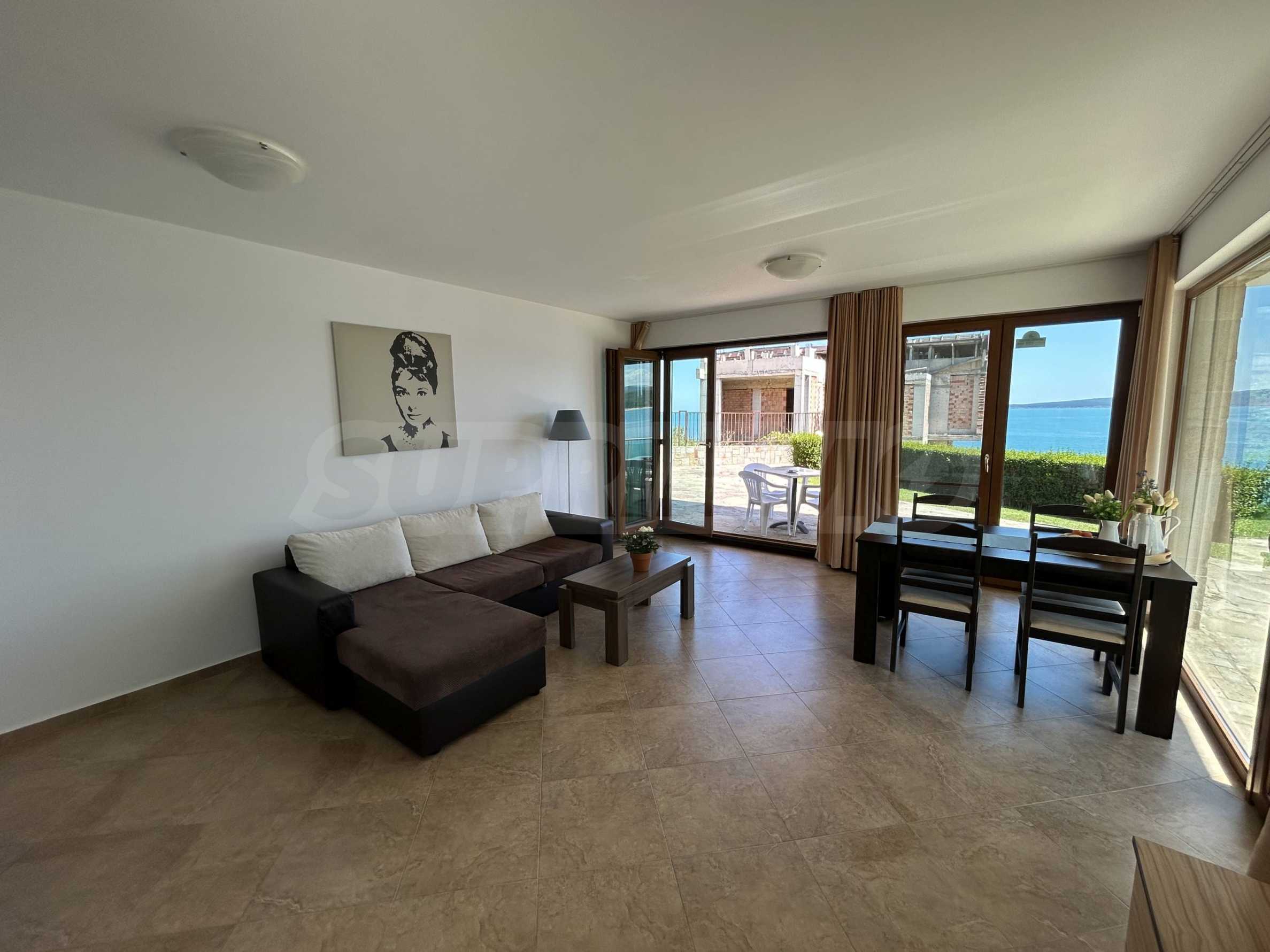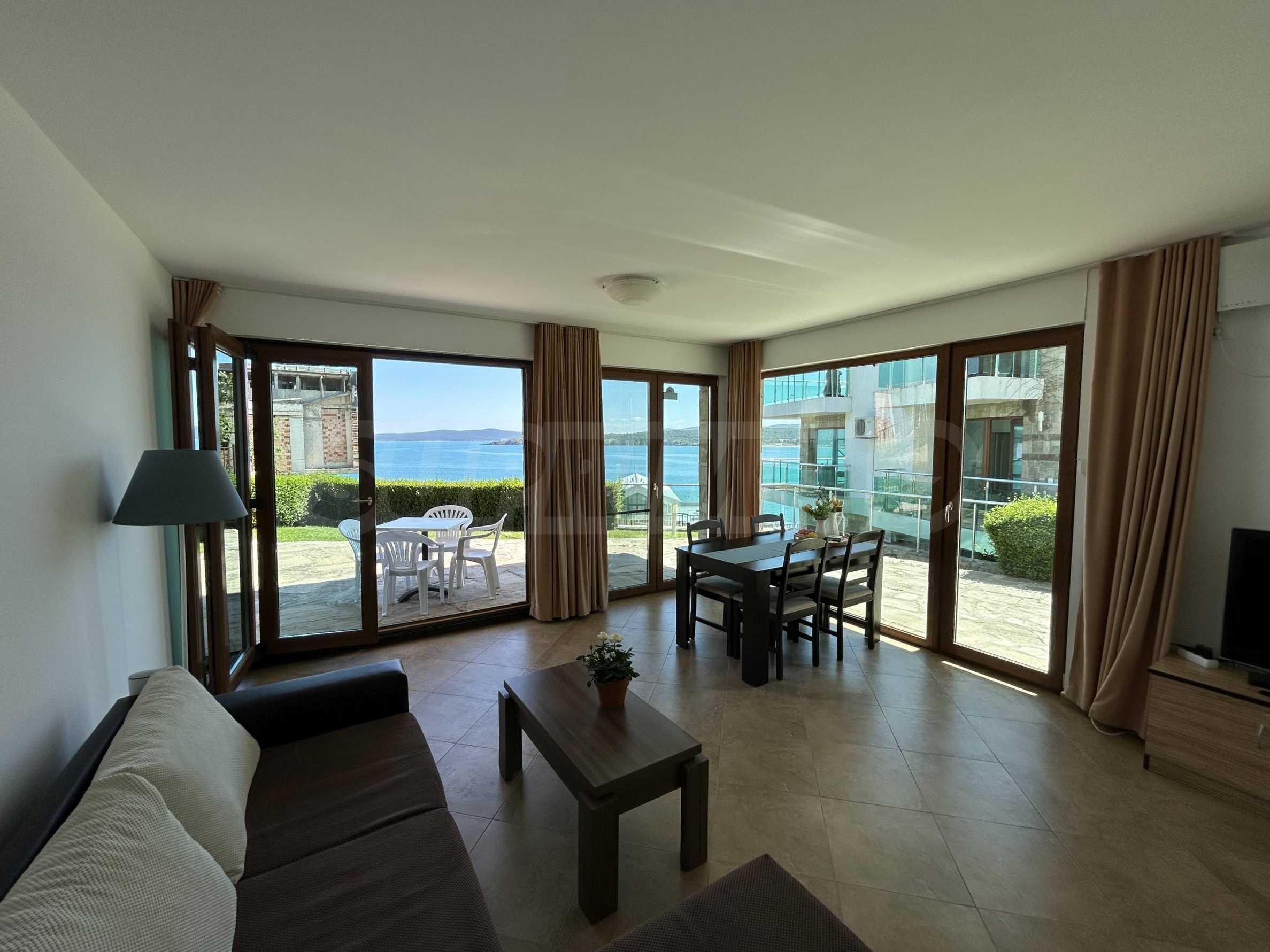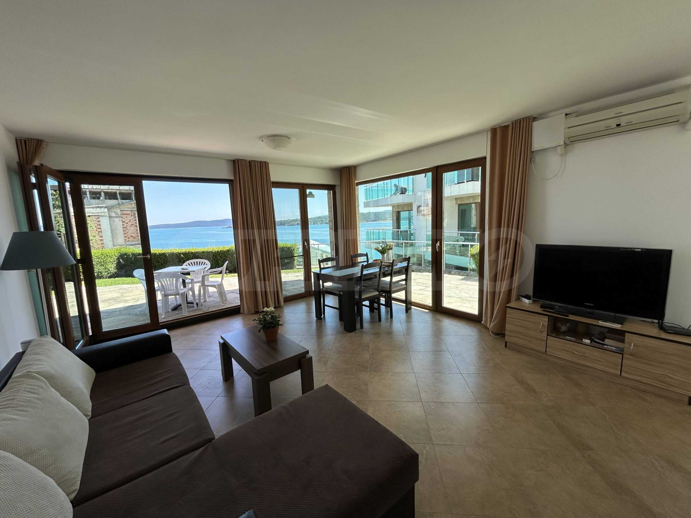 Oferujemy na sprzedaż jasne i przestronne mieszkanie z jedną sypialnią i pięknym widokiem na morze, położone w strzeżonym kompleksie na pierwszej linii brzegowej w Sozopolu.