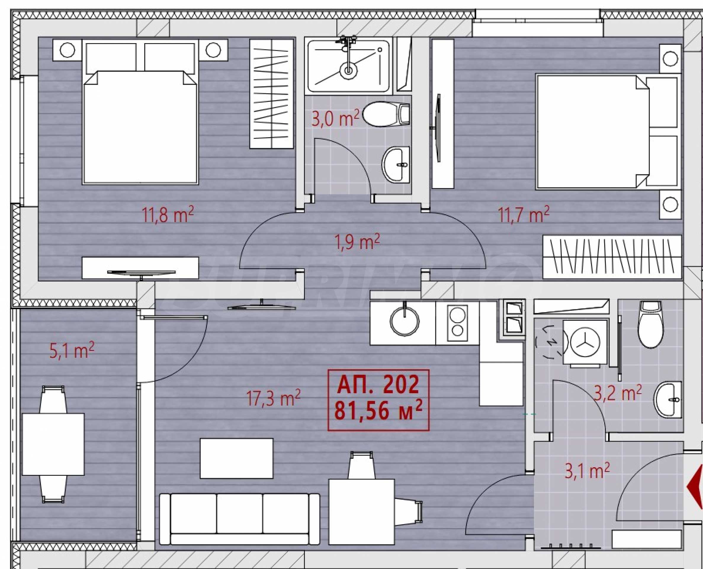 Nieruchomość o powierzchni całkowitej 83,30 m2 położona jest na 4 piętrze i składa się z: przedpokoju, salonu z aneksem kuchennym, dwóch sypialni, łazienki z toaletą, pomieszczenia sanitarnego oraz tarasu.